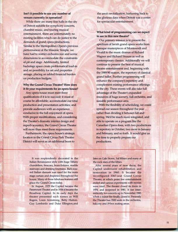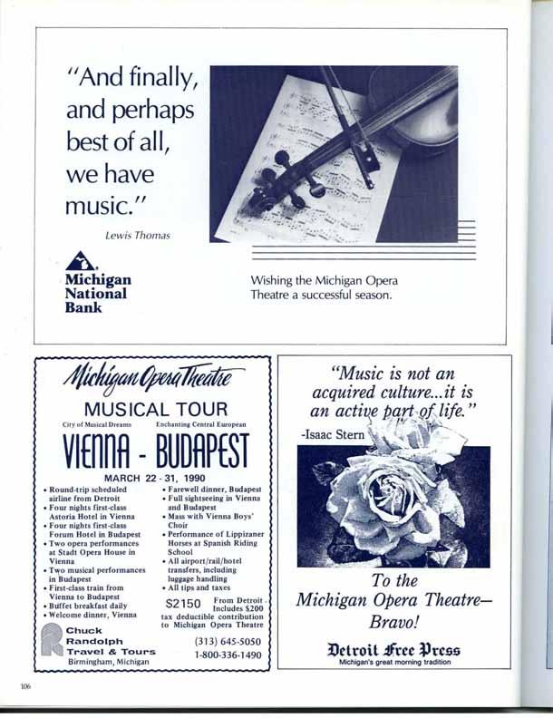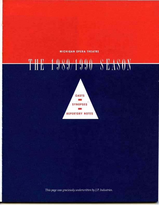 It is indeed a pleasure for me to welcome you to Michigan Opera Theatre's nineteenth season, and to the new vistas of the 1990s. It has been not so many years since we established this company with the encouragement and support of many individuals from the Detroit community. Still fewer years have passed since the company began its odyssey toward acquiring a permanent home, an opera house that could appropriately support the myriad activities and diverse repertory which characterize any great opera company. With the dedicated efforts of leaders from Michigan Opera Theatre's Board of Directors and Trustees, this dream has begun the transformation toward reality The Grand Circus Theater, nee Capitol Theater, in Detroit's thriving Grand Circus Park district , has been selected as the vitally necessary future home of Michigan Opera Theatre .