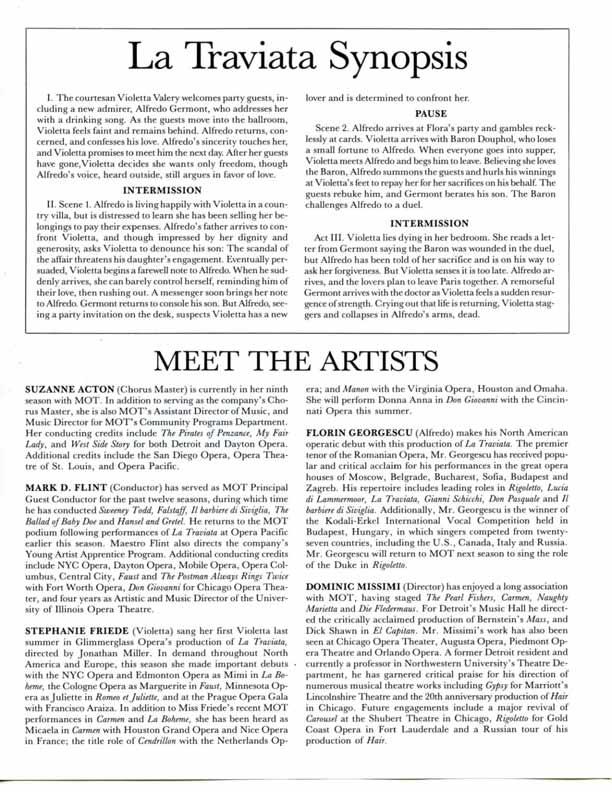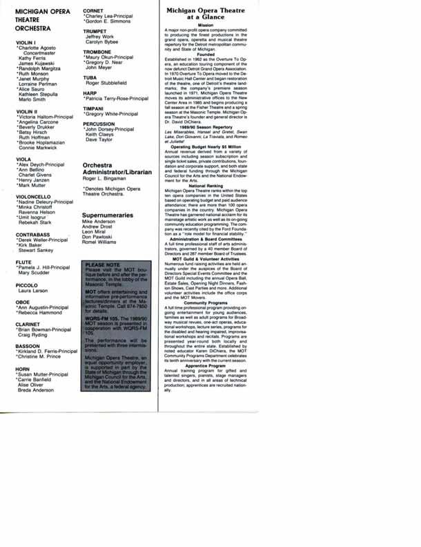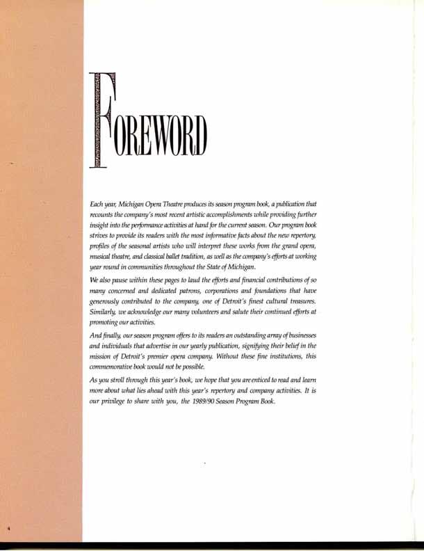 Each year, Michigan Opem Theatre produces its season progmm book, a publication that recounts the company's most recent artistic accomplishments while praviding further insight into the performance activities at hand for the current season. Our progmm book strives to provide its readers with the most informative facts about the new repertory, profiles of the seasonal artists who will interpret these works from the grand opera, musical theatre, and classical ballet tradition, as well as the company's efforts at working year round in communities throughout the State of Michigan.