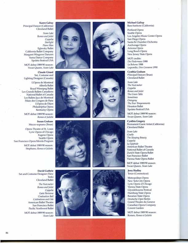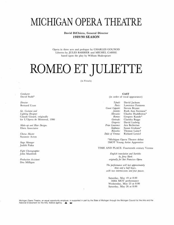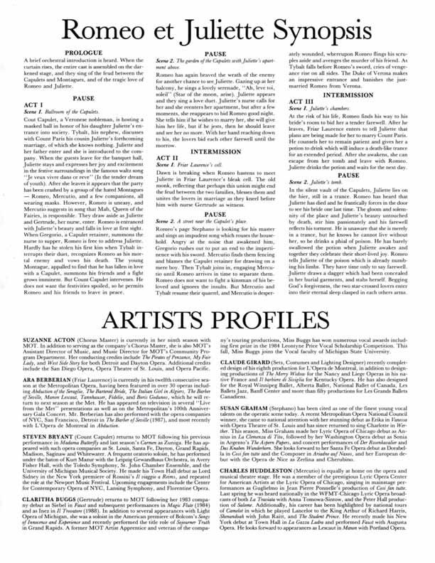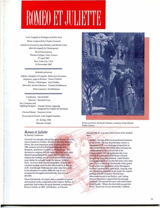 For hi s to ri ca l background, artist ph otos and biographical information o n Romeo et Julielle, th e 19 89/90 season program is available for sale in th e lo bby