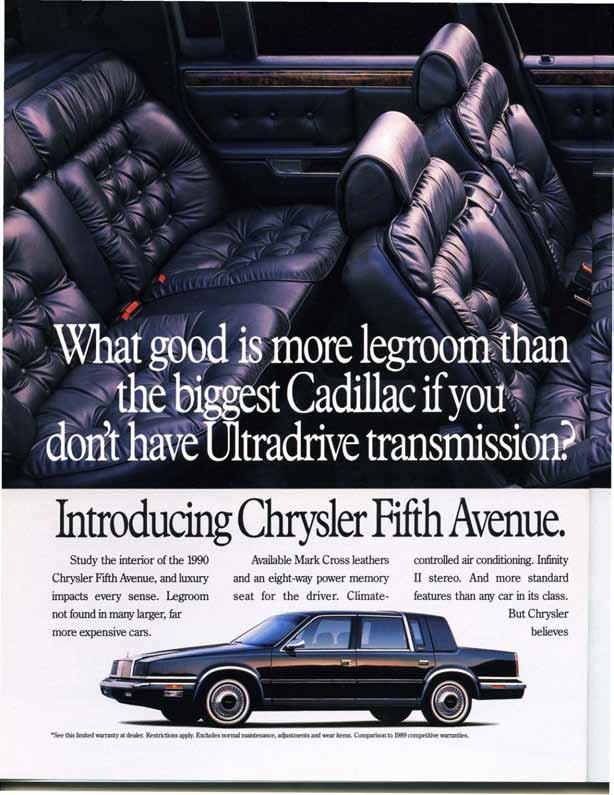 Introducing Chrysler Fifth Avenue. Study the interior of the 1990 Chrysler Fifth Avenue, and luxury impacts every sense. Legroom not found in many larger, far more expenSIve cars. Available Mark Cross leathers and an eight-way power memory seat for the driver. Climatecontrolled air conditioning. Infinity II stereo. And more standard features than any car in its class. But Chrysler believes "See this limited warranty at dealer. Restrictions apply. Excludes nonnal maintenance, adjustments and wear items. Comparison to 1989 competitive warranties .---------=-=-Copyright 2010, Michigan Opera Theatre