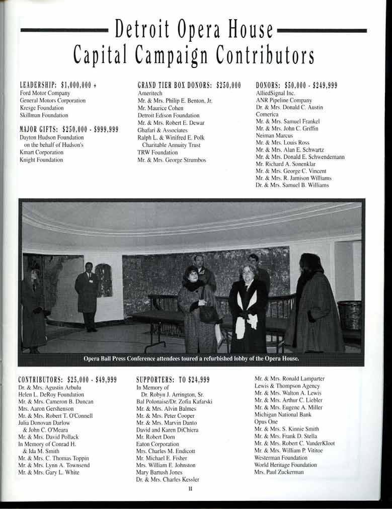 gam sure all of you share with me a sense of anticipation at having begun construction on the new Detroit Opera House beginning with the groundbreaking ceremony there last June. The opening of the Opera House in the fall of 1995 will be the fulfillment of this company ' s long-term goal to control its own performance facility , one which allows us to serve the community fully, and which compares favorably in function, size and aesthetics with those of other major world cultural centers . Many corporations, foundations and individuals have generously demonstrated their support toward this end , for which we are most grateful. For a complete listing of these contributors , please refer to page II.