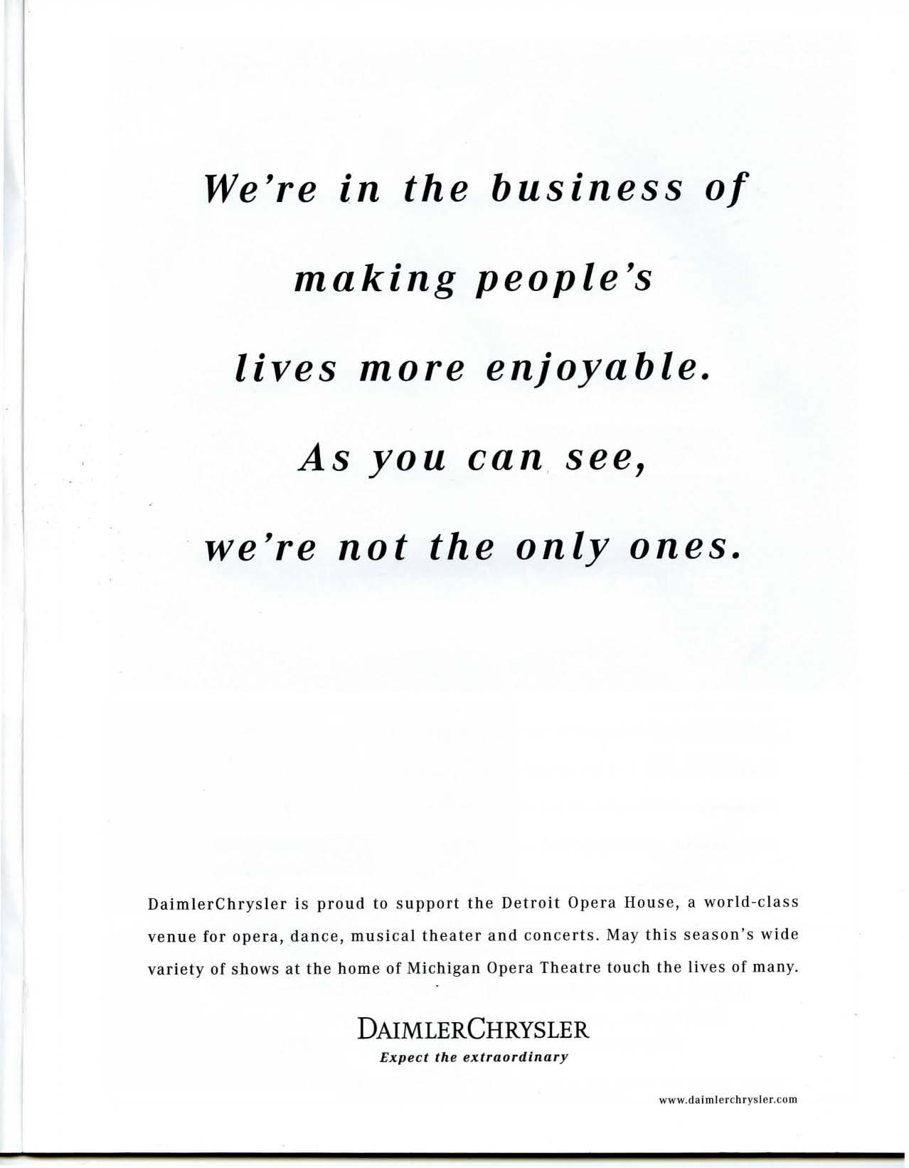 DaimlerChrysler is proud to support the Detroit Opera House, a world-class venue for opera, dance, musical theater and concerts. May this season's wide variety of shows at the home of Michigan Opera Theatre touch th e lives of many.