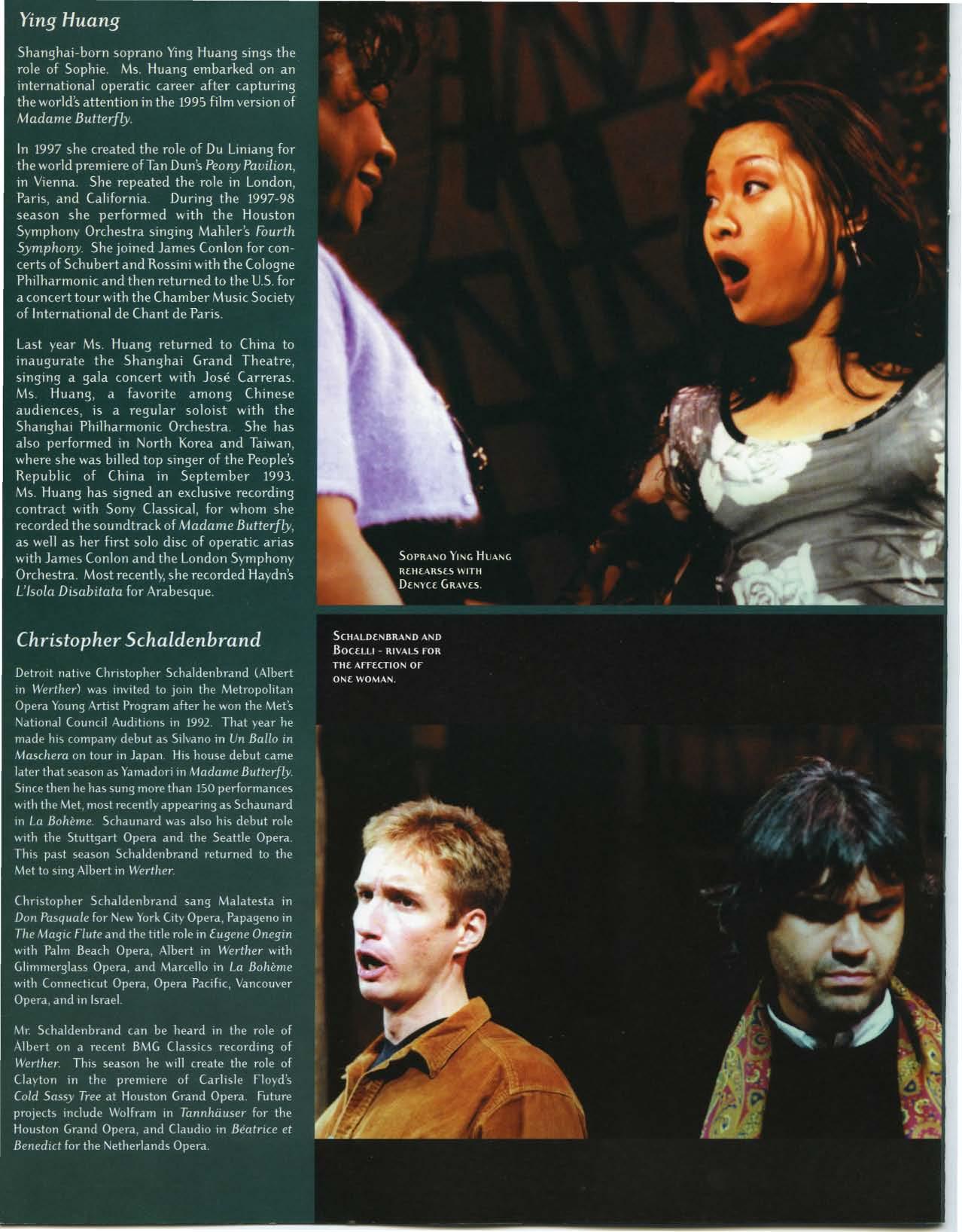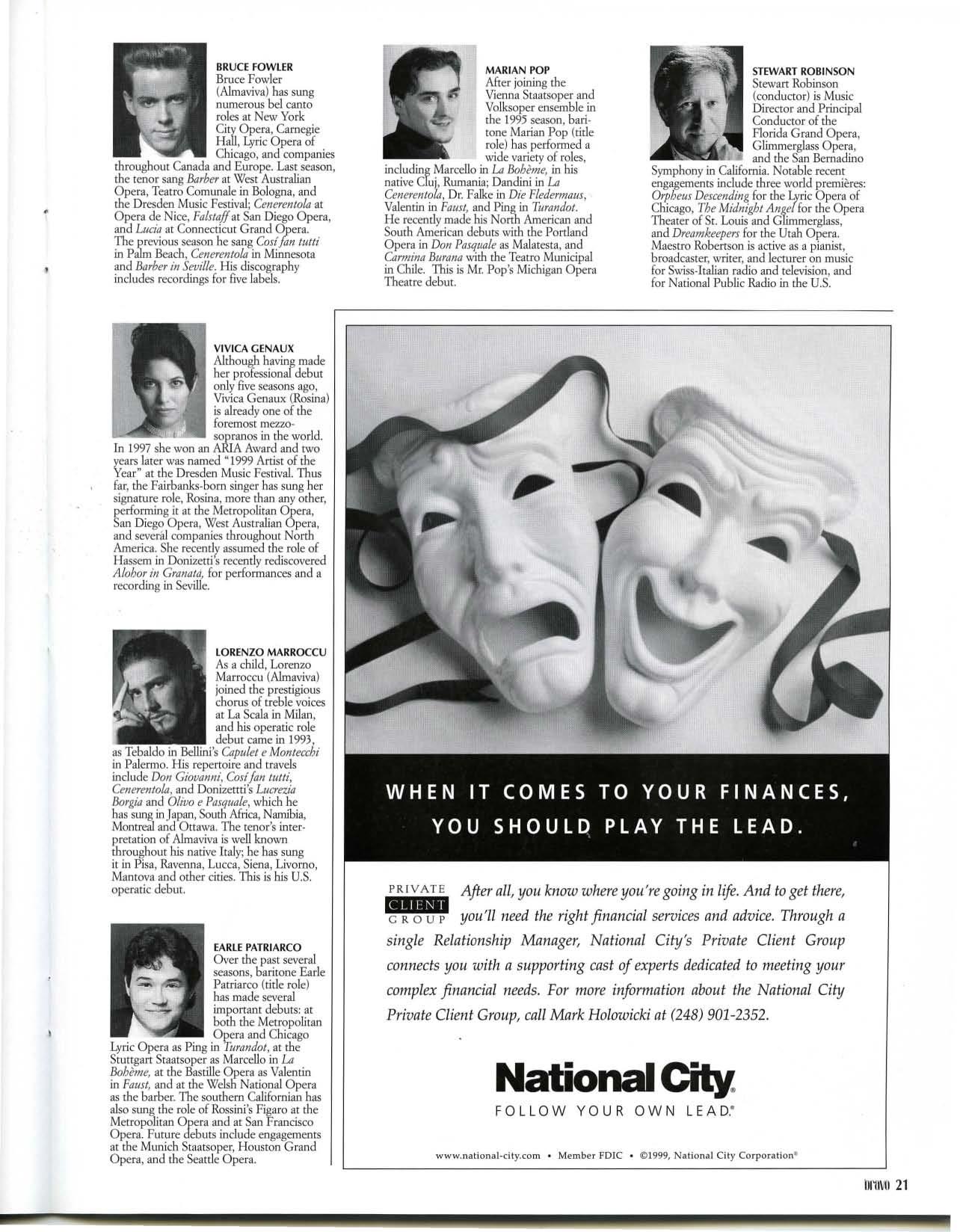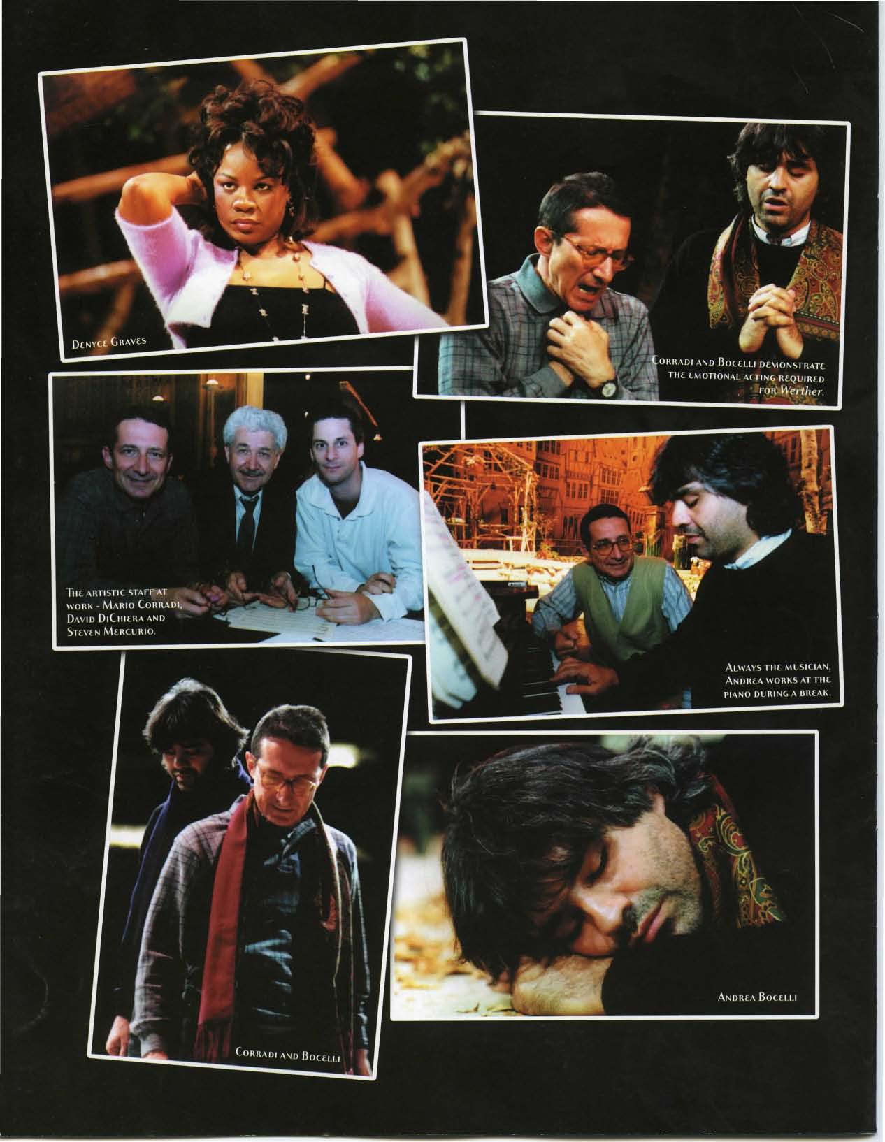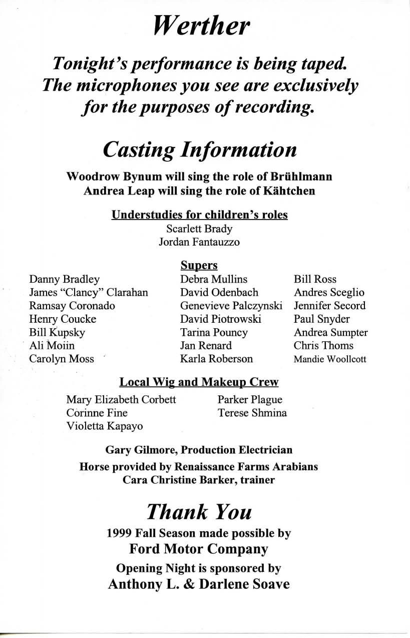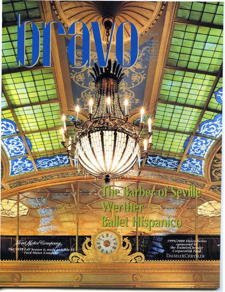 Thank you for being with us for the 1999 Fall Season. Michigan Opera Theatre makes history as it brings opera's brightest stars as well as a group of young and exciting artists to the stage of the Detroit Opera House. Among the five great masterpieces that make up the season are three works that hive never been seen on MOT's stage. Massenet's Werther takes center stage for the first time in October. The stars, Andrea Bocelli and Denyce Graves , make their MOT debuts and Mr. Bocelli's appearance will be his North American debut in an opera.