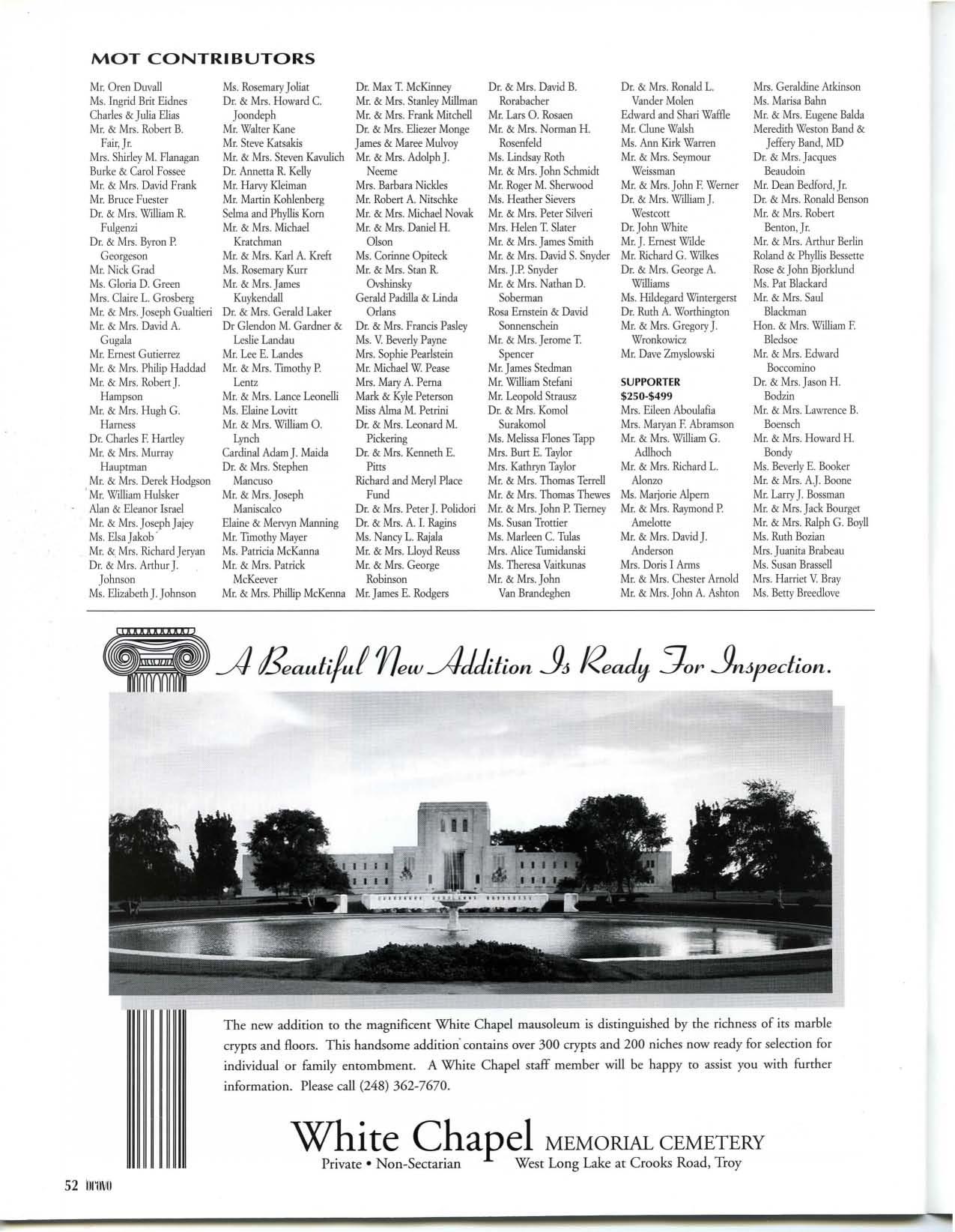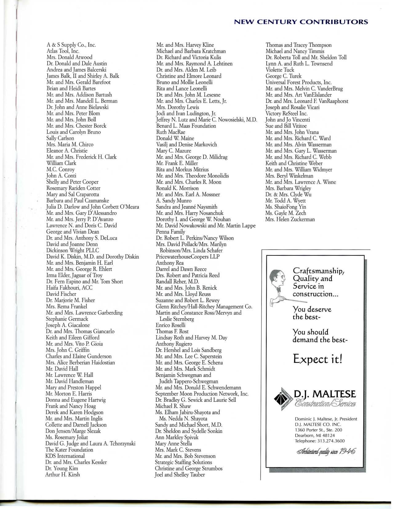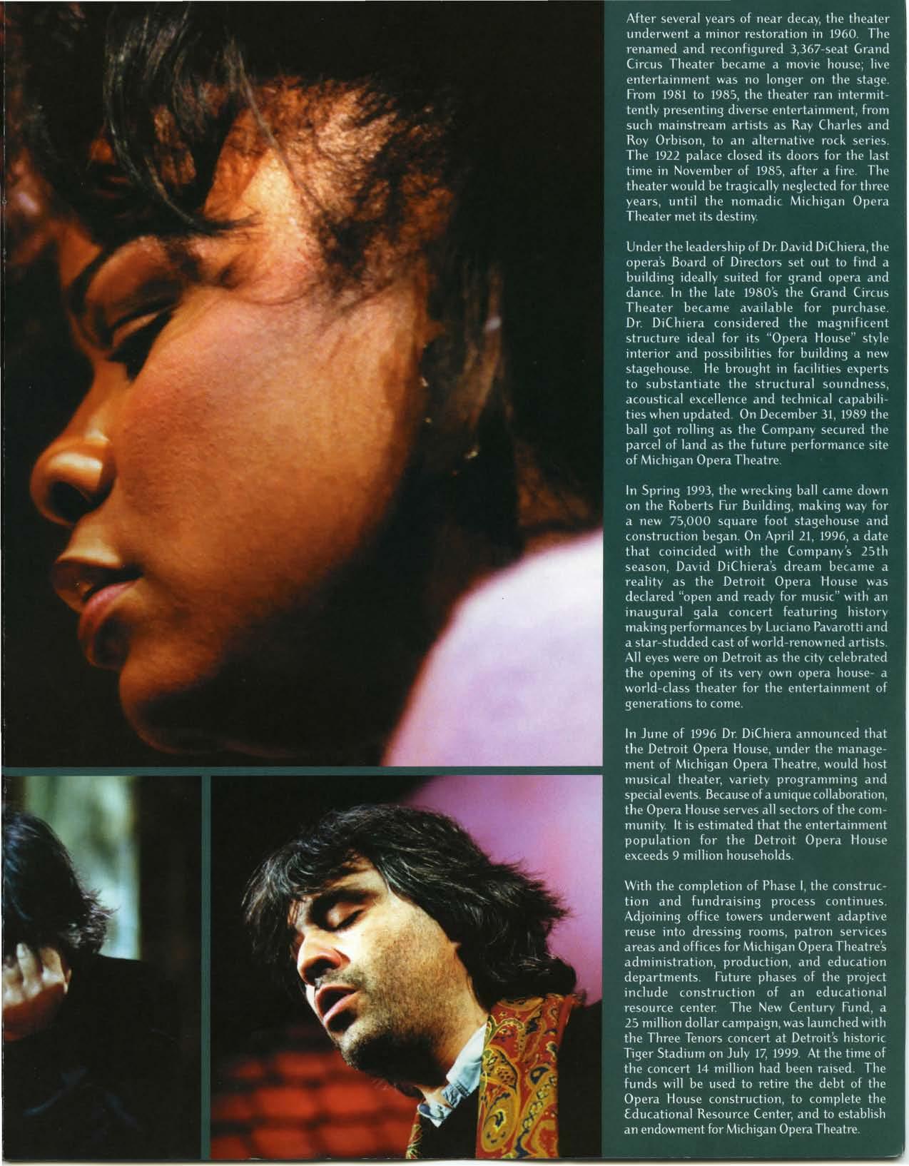 The Three Tenors concert launched MOT's New Century Fund, a fund-raising campaign that will enable us to complete the Detroit Opera House by funding the renovation of the Broadway tower, retire the construction debt so that the opera company may focus its funds artistically and educationally, and establish an endowment for future growth and stability. When completed , the Broadway tower will serve as an educational resource center with studios , classrooms, a media center, and an intimate theater for young artists. This renovation equips the Opera House for the ne xt century. The goal set for the New Century Fund is $25 million. We are proud to report that The Three Tenors concert , made possible by Ford Motor Company, provided the opportunity to raise the first $14 million With your help we will reach our very attainable goal I encourage you to get involved