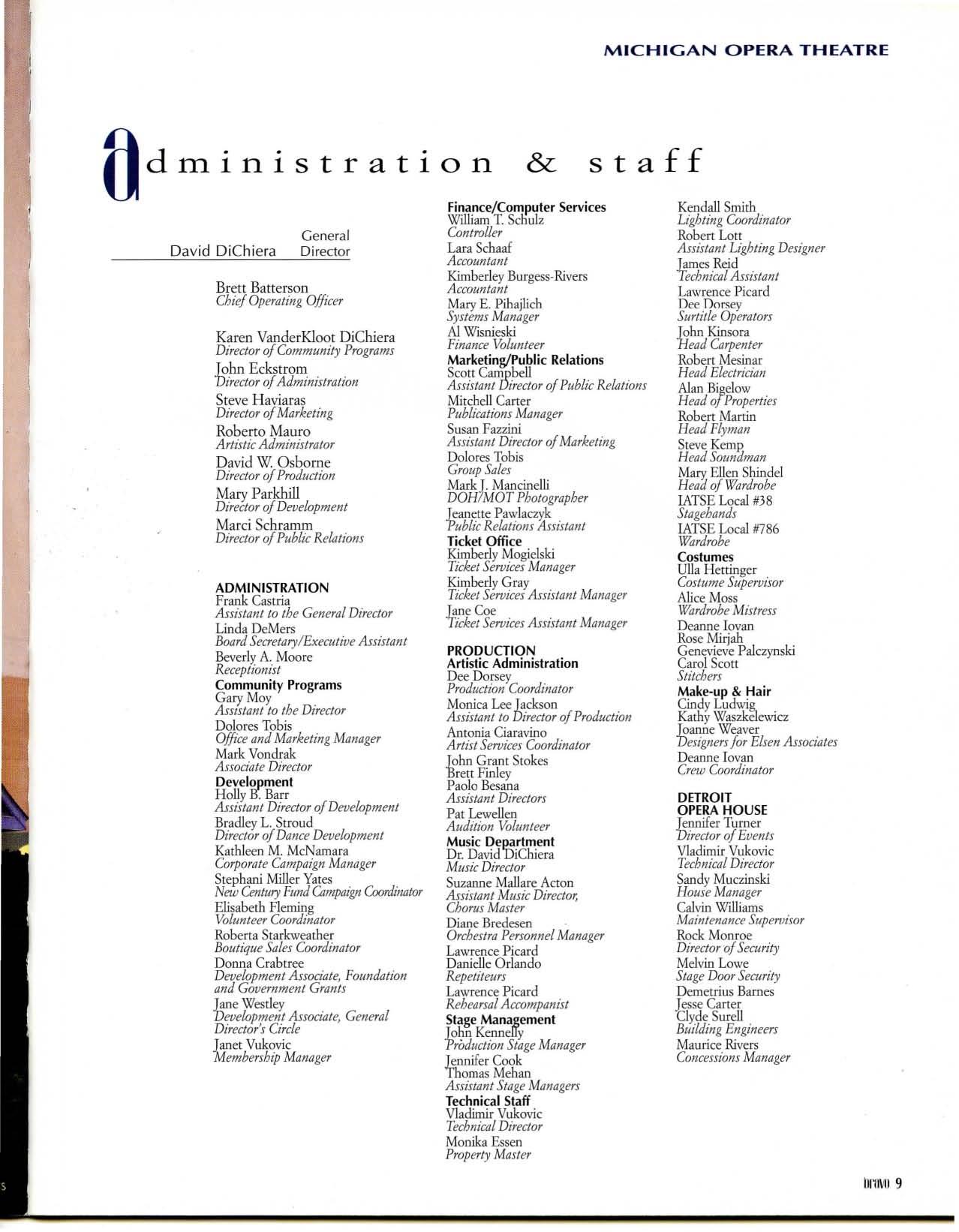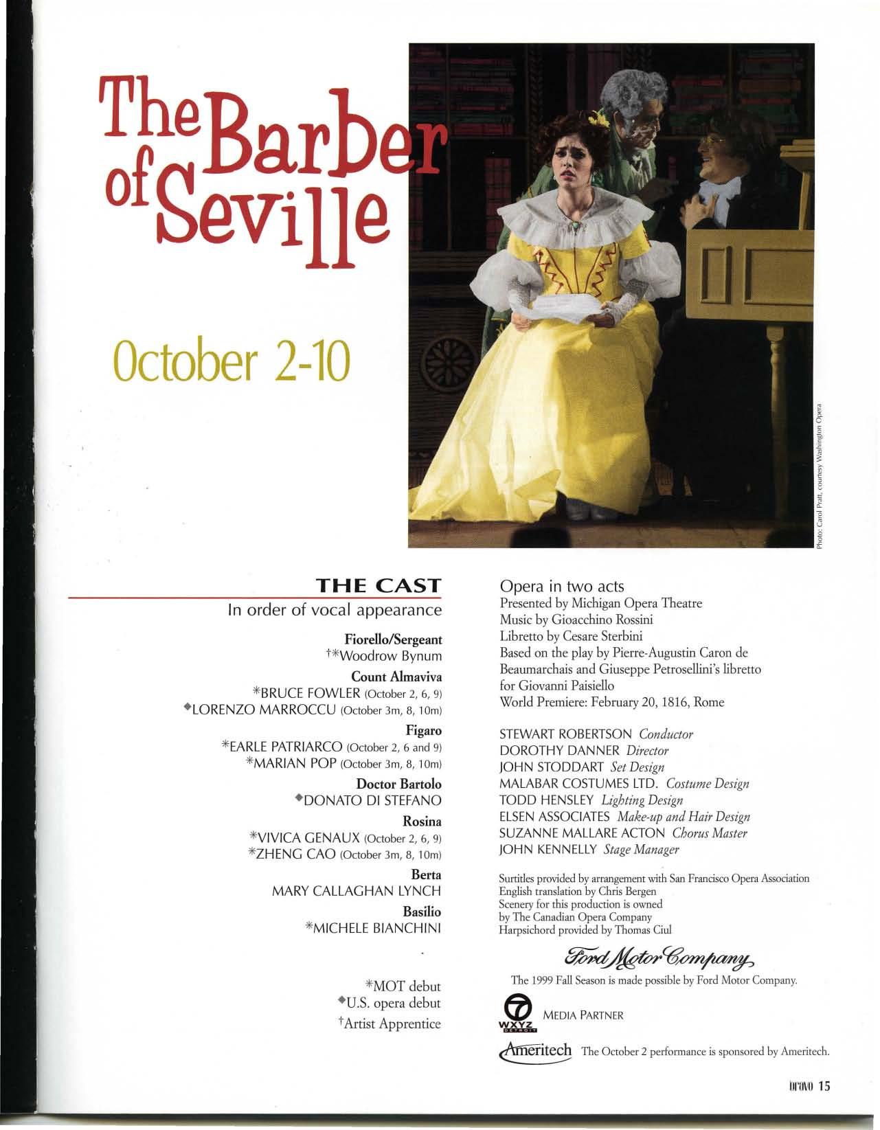 1999 Detroit Ope r a House ON MESSAGE 2 From the General Director MICHIGAN OPERA THEATRE 5 Board of Directors and Trustees 9 Administration and Staff CAMPAIGN INFORMATION 10 D etroit Opera House New Century Fund CONTRIBUTORS 43 New Century Fund Contributors 49 Michigan Opera Theatre Contributors OUTREACH & EDUCATION 46 Community Programs ON STAGE 15 The Barber of Seville 18 20 23 25 26 28 b y Giaocchino Rossini Figaro here, Figaro there Photo story researched by Timothy Paul Lent z The Cast Werther by Jules Massenet The Cast On Suicide and Other Silly Fashions by Da ya na Steteo The Discreet Charm of Jules Massenet by Henry Prunieres 31 Ballet Hispanico ORCHESTRA & CHORUS 41 Michigan Opera Theatre Orchestra and Chorus DETROIT OPERA HOUSE 56 Detroit Opera Hous e Information Copyright 2010, Michigan Opera Theatre
