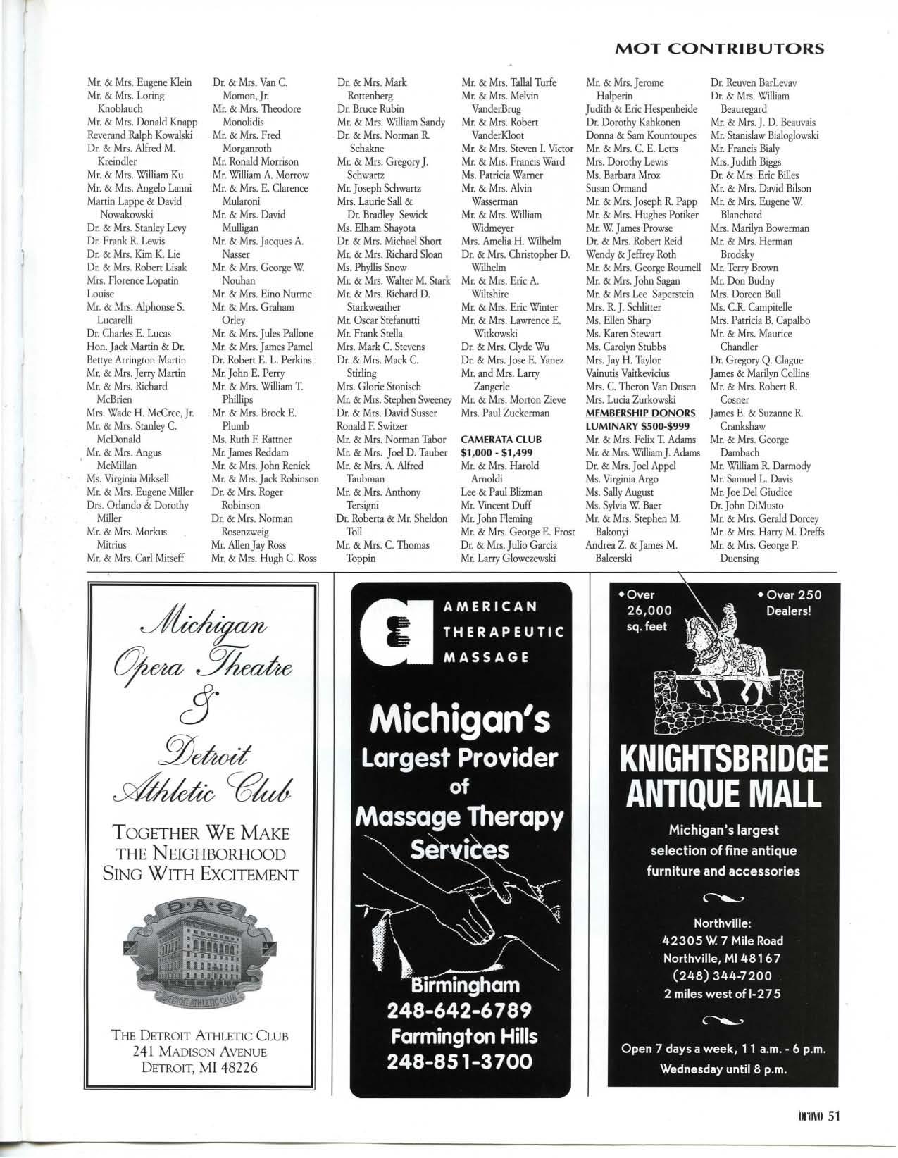 The LS 400 has sleek lines. Rich amenities. An innovative Vehicle Skid Control (VSC)* system to help keep it on the straight and narrow path. And thanks to an all -powerful 290-horsepower V8 engine, it's one of the fastest luxury sedans in it s class . A fact which should have the spin doctors , well, spinning Jump on the bandwagon today at a Lexus dealer near you. YOUR LEXUS DEALER. PURSUING PERFECTION. meadelexus.com MEADE LEXUS OF SOUTHFIELD 28300 Northwestern Highway (800) 48 MEADE MEADE LEXUS OF LAKESIDE M59 at North Pointe Boulevard (800) 486-5253 © 1999 Lems a Division of Toyo ta Motor Sa les, U.S.A. , Inc. Lexus reminds you to wear seatbelts, secure children in rear sea t , obey all speed laws and drive responsibly. ·VSC effective ness varies with ve hicle speed, roa d conditions and steering input. Copyright 2010, Michigan Opera Theatre