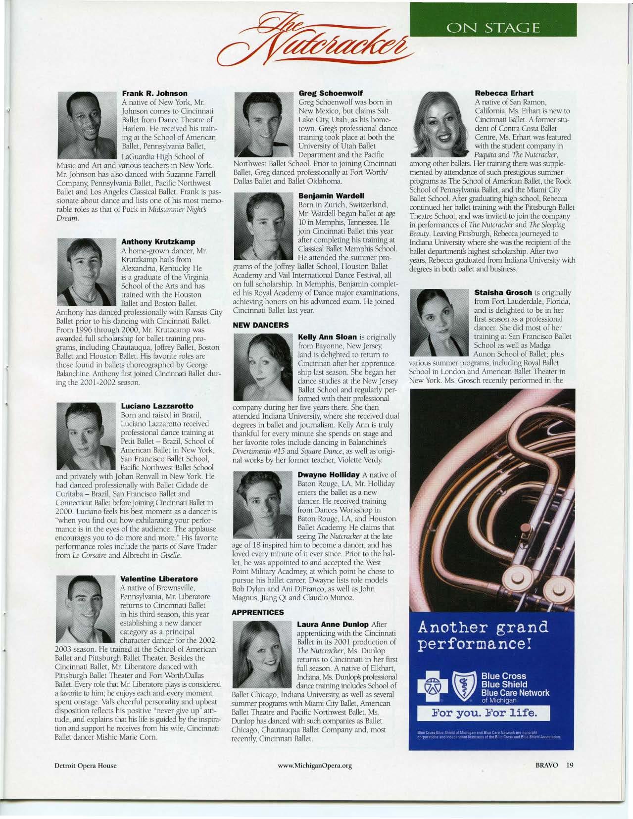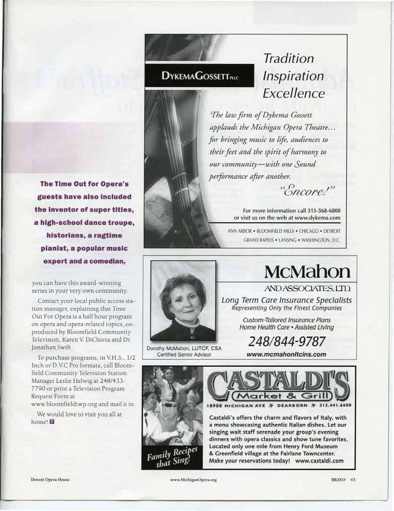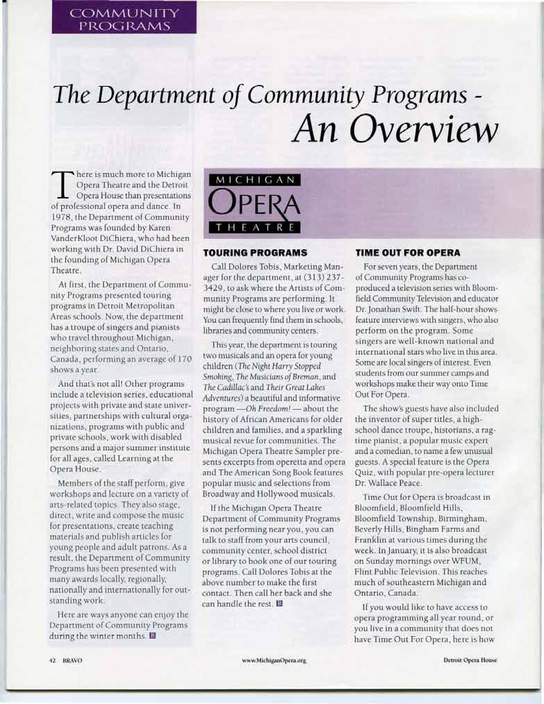 Other on-going projects include the Dance Alliance, a co ll aborative audience d evelop m ent and education effort between the Opera House and area danc e studios. Now in its third year, the www.MichiganOpera.org