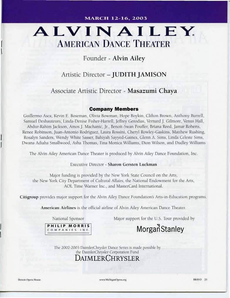 At DaimlerChrysler Corporation , we know a little something about moving performances. We proudly support the Michigan Opera Theater and are honored to sponsor the DaimlerChrysler Dance Series. Thank you for bringing the power of music and dance to our community.