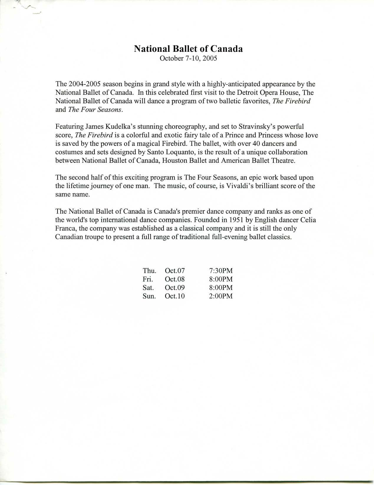 The National Ballet of Canada is Canada's premier dance company and ranks as one of the world's top international dance companies. Founded in 1951 by English dancer Celia Franca, the company was established as a classical company and it is still the only Canadian troupe to present a full range of traditional full-evening ballet classics.