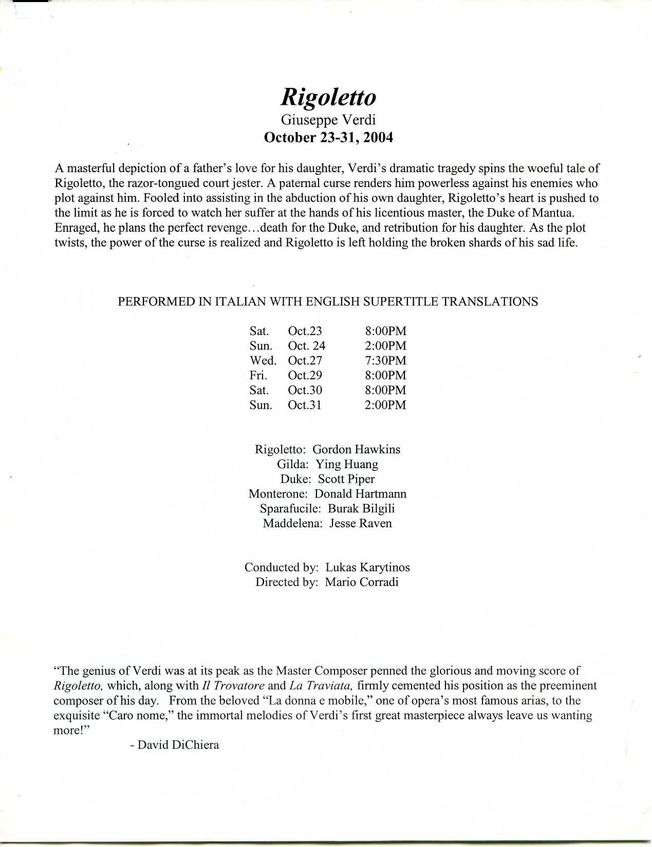"The genius of Verdi was at its peak as the Master Composer penned the glorious and moving score of Rigoietto, which, along with Ii Trovatore and La Traviata, firmly cemented his position as the preeminent composer of his day. From the beloved "La donna e mobile," one of opera's most famous arias, to the exquisite "Caro nome," the immortal melodies of Verdi's first great masterpiece always leave us wanting more!"