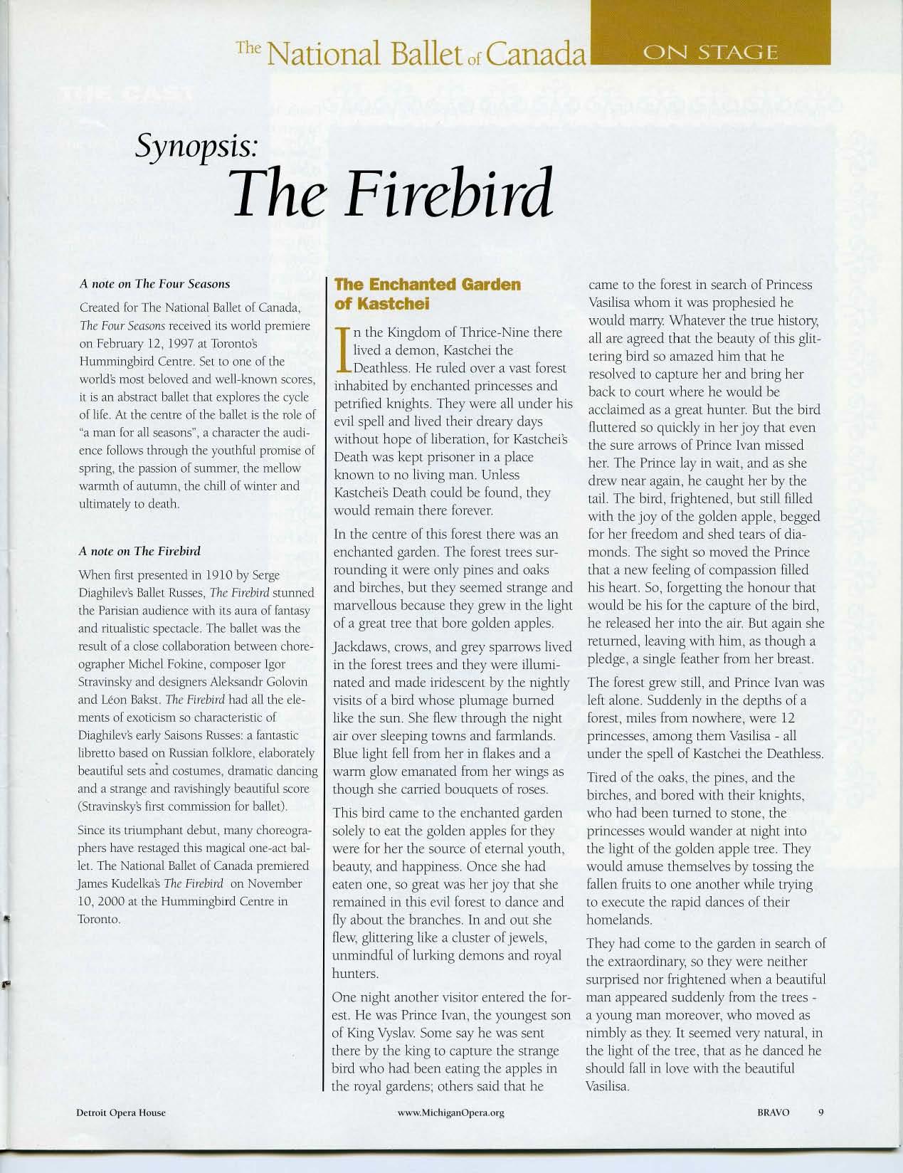 Featuring James Kudelka's stunning choreography, and set to Stravinsky's powerful score, The Firebird is a colorful and exotic fairy tale of a Prince and Princess whose love is saved by the powers of a magical Firebird. The ballet, with over 40 dancers and costumes and sets designed by Santo Loquanto, is the result of a unique collaboration between National Ballet of Canada, Houston Ballet and American Ballet Theatre.