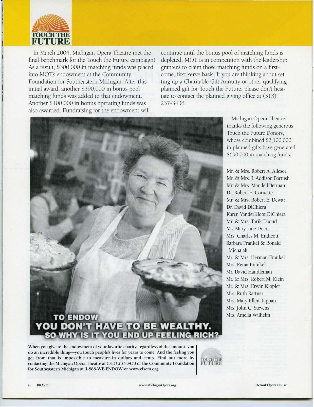Achi eveme nt campaign that we have been able to undertake these monumenta l projects. I j oin everyone at Michigan Ope ra Theatre in extend ing my deepest gratitud e to the many ge n erous individuals, co rporations and foundation s that have committed their supp ort to our visio n and made this dream -more than 30 yea rs in the making-a rea lity