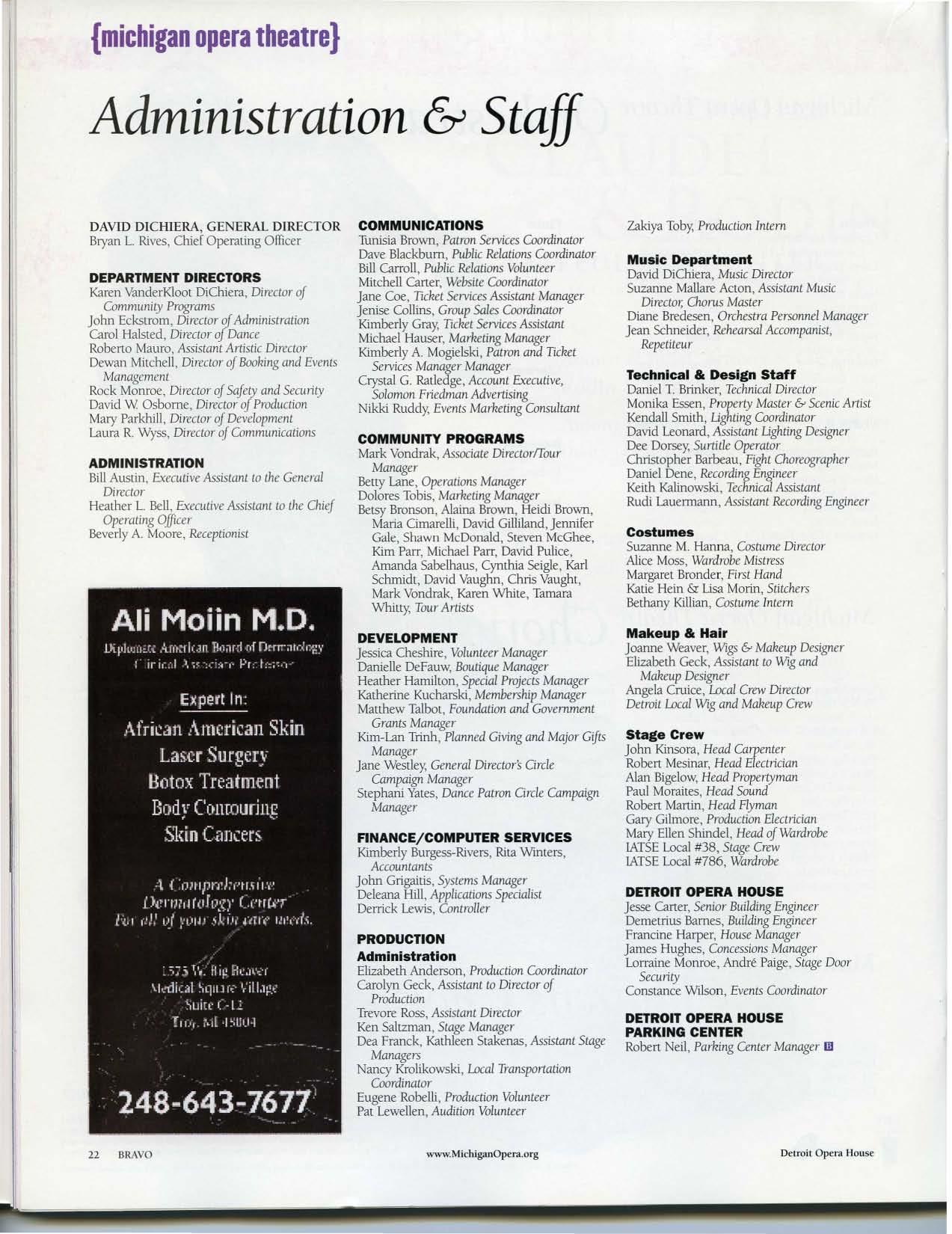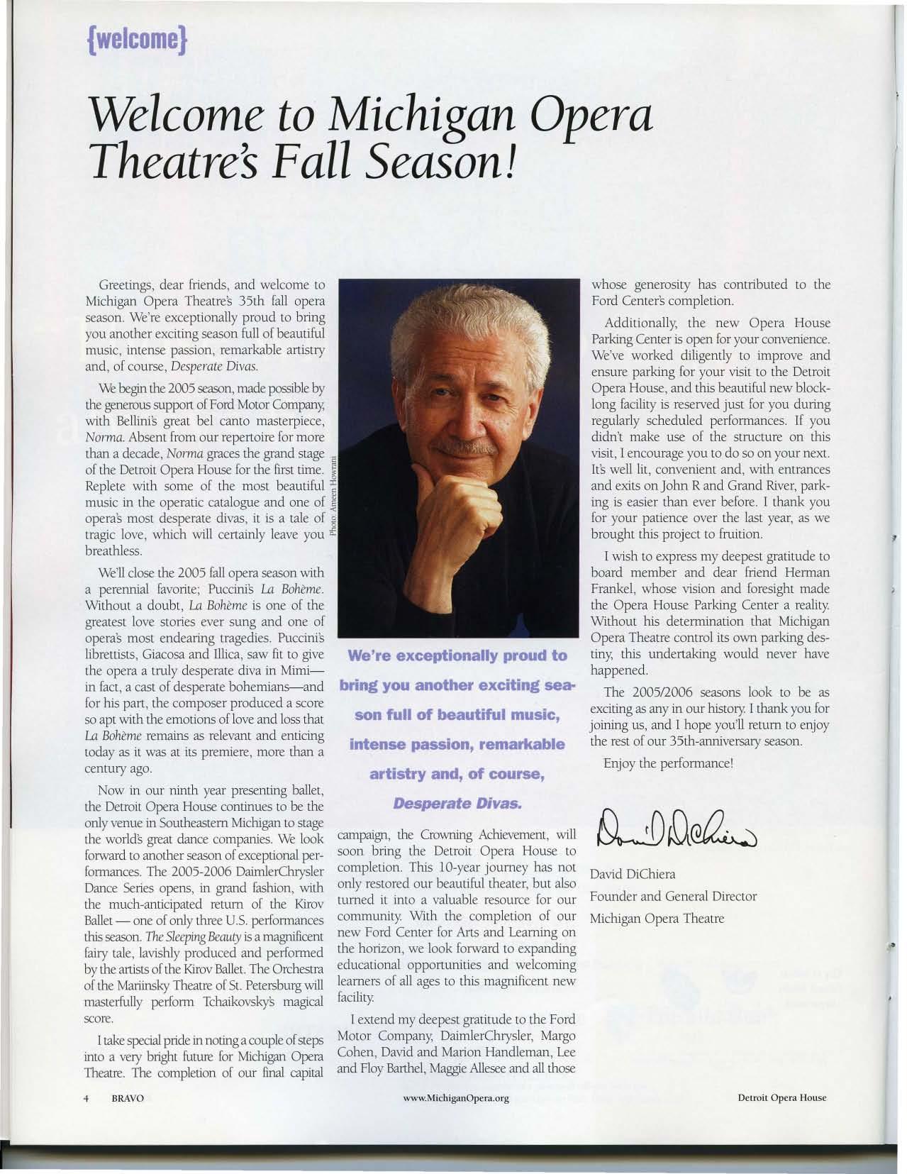 Add iti ona lly, th e new Opera House Parking Center is open for your convenience We 've worked diligently to improve and ensure parking for yo ur visit to the Detroit Opera House, and this b eautifu l new blocklong faCility is reserved just for yo u during regu larly scheduled performances. If you didn't make u se of the s tru cture on this visit , I en courage you to do so on your next. It 's well lit, con ve n ient and , with entrances an d exits on John R and Grand River, p arking is eas ier than ever b efore I thank you fo r your patience over the last yea r, as we brought this project to fruiti on.