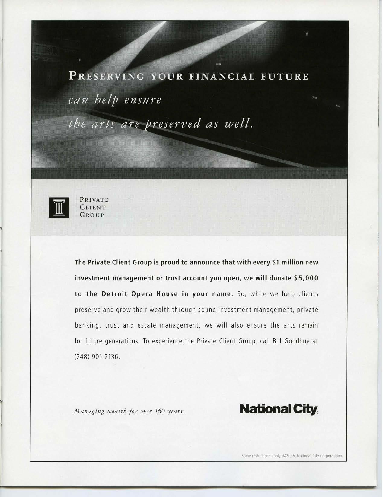 The Private Client Group is proud to announce that with every $1 million new investment management or trust account you open, we will donate $5,000 to the Detroit Opera House in your name. So, while we help clients preserve and grow their wealth through sound investment management, private banking, trust and estate management, we will also ensure the arts remain for future generations. To experience the Private Client Group, call Bill Goodhue at (248) 901-2136. Managing wealth for over 160 years.