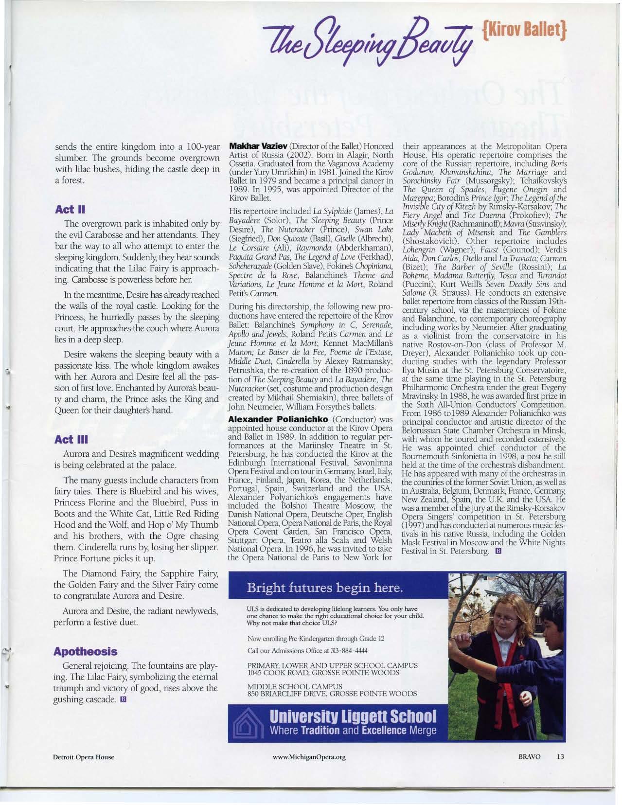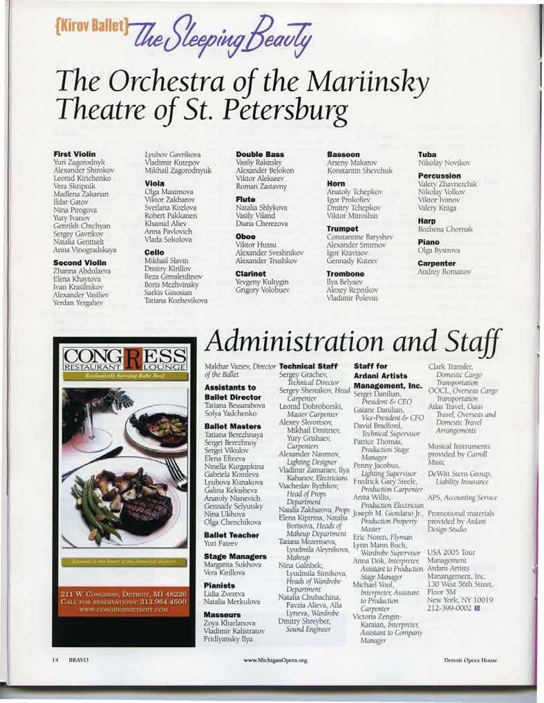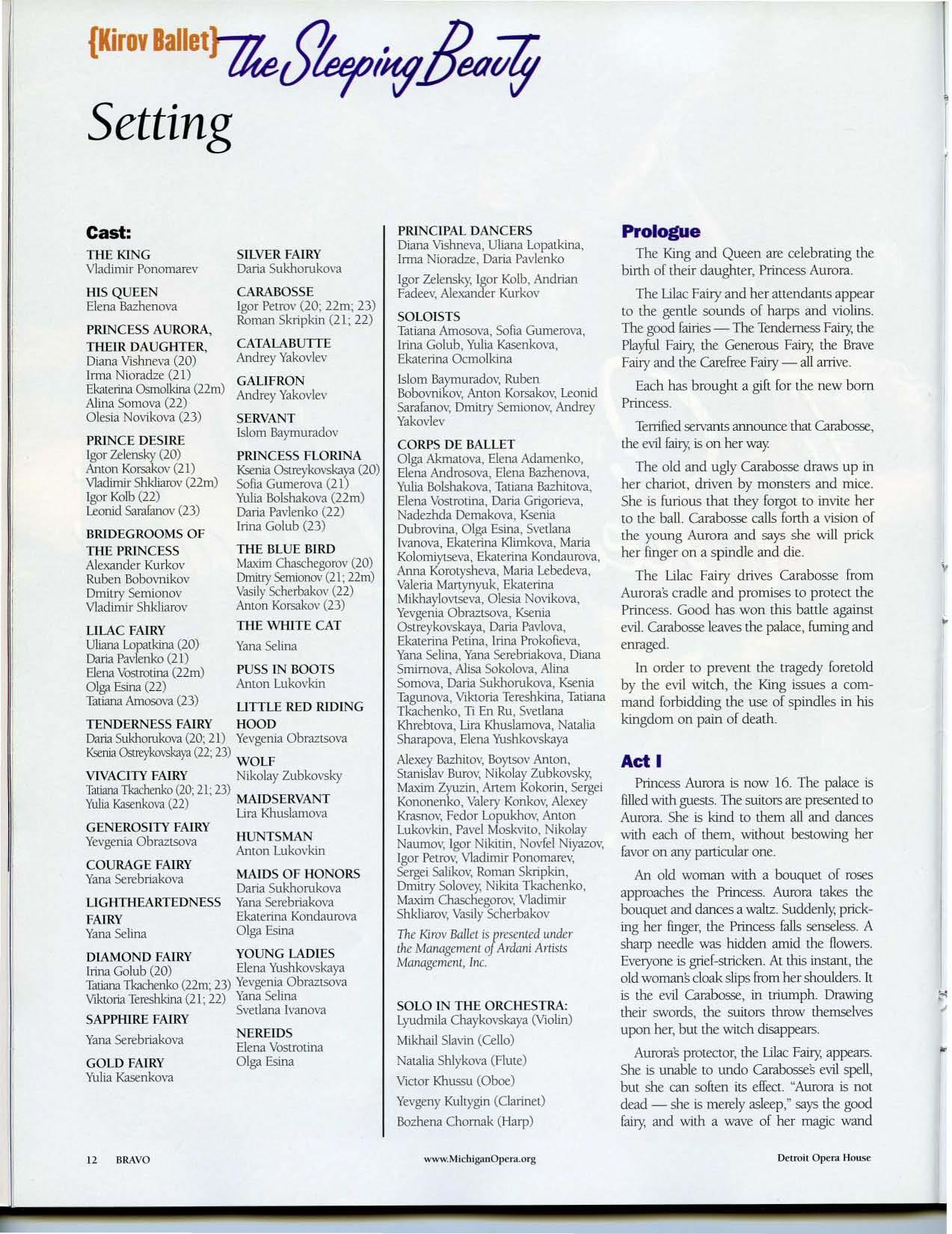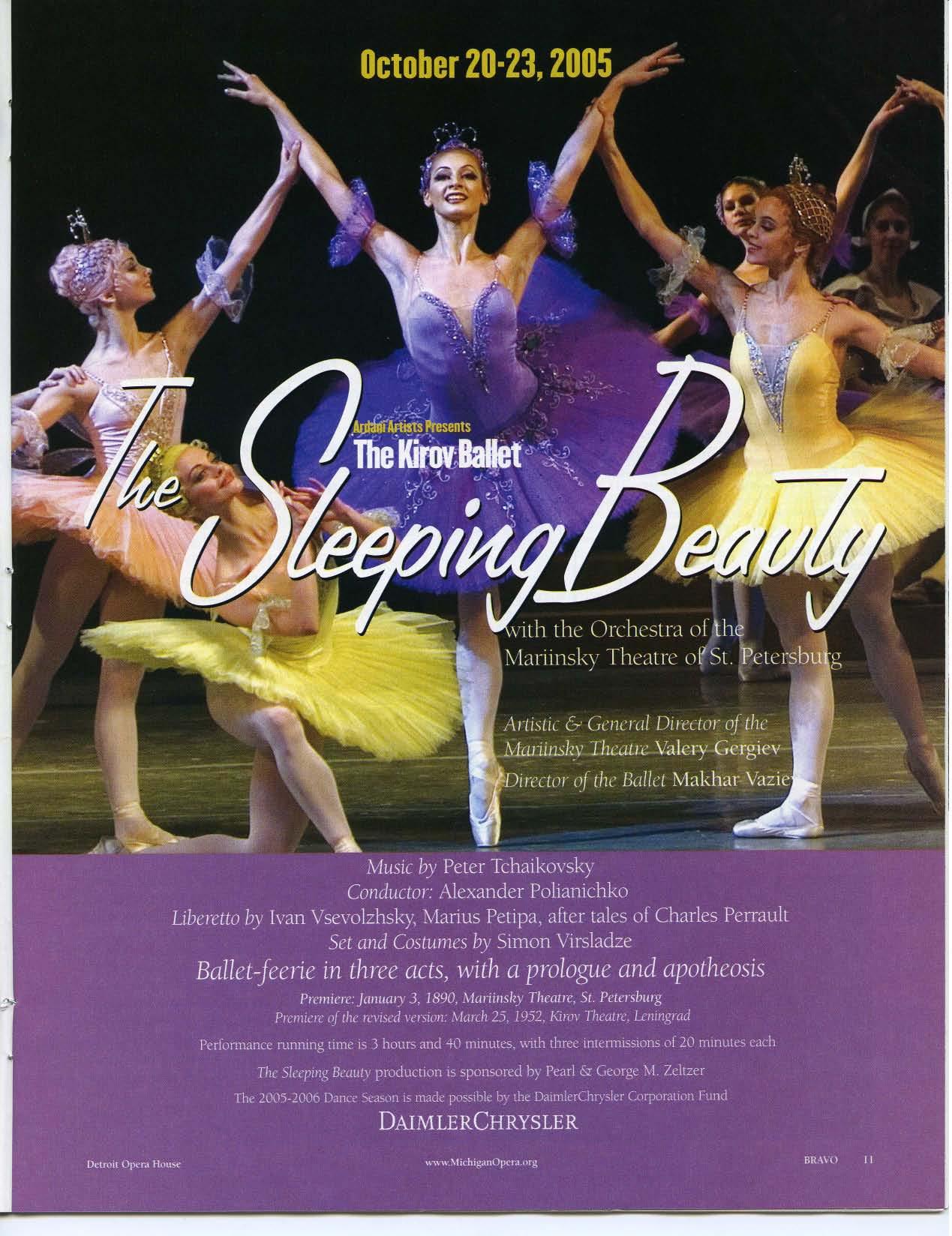 Now in our ninth year presenting ballet , the Detroit Opera House continu es to be the only venue in Southeastern Michigan to stage the worlds great dan ce companies. We look forwa rd to another season o f exceptional p erformances. The 2005-2006 DairnlerChrysler Dance Series opens , in grand fashion , with the mu ch- anticipa ted return of the Kirov Ballet - one of only three U.S performances this season. The Sleeping Beauty is a magnificent fairy tale, lavishly produced and performed by the artists of the Kirov Ballet. The Orch estra of the Mariinsky Theatre of St. Petersburg will masterfully perform Tchaikovskys magical
