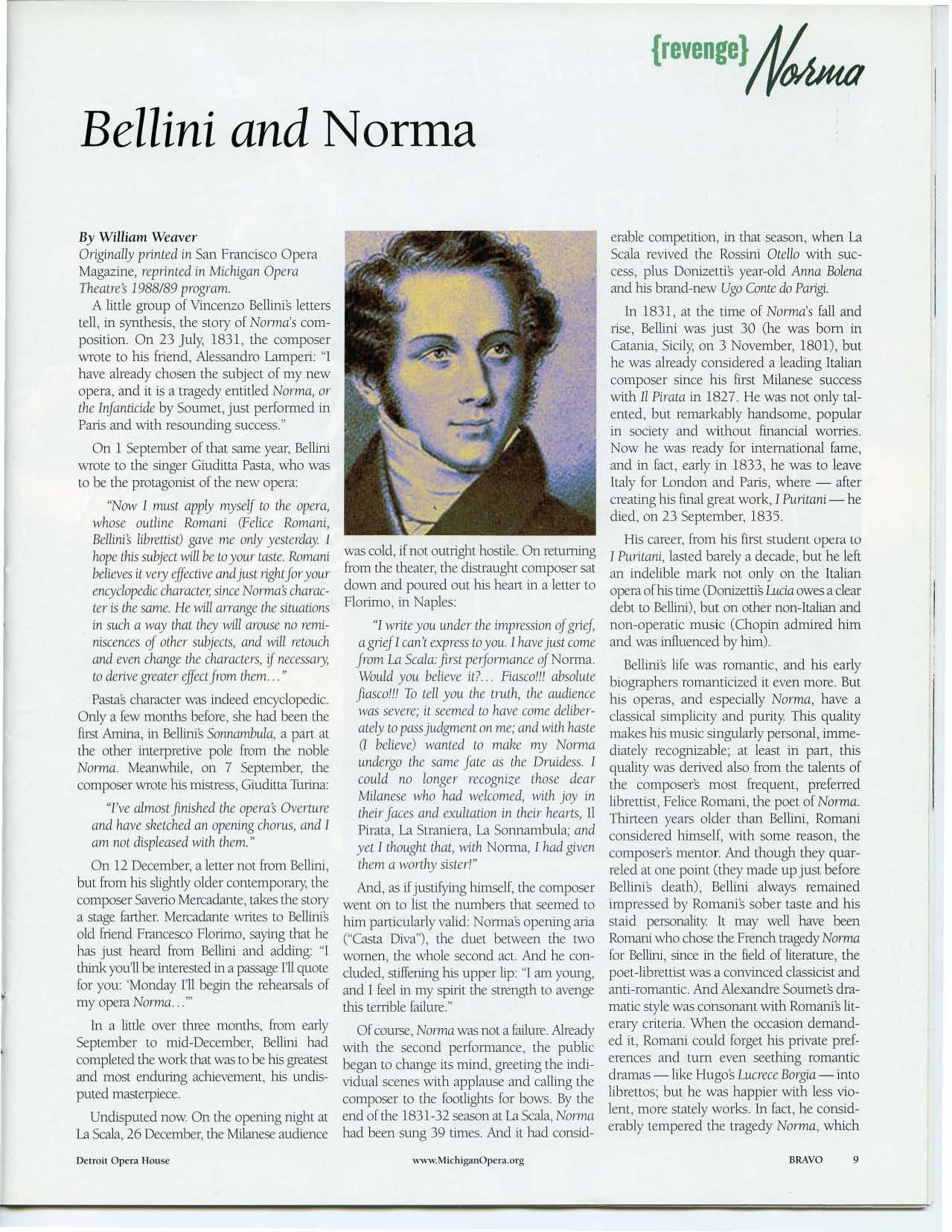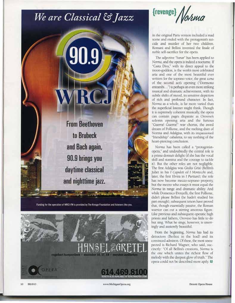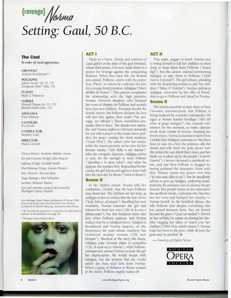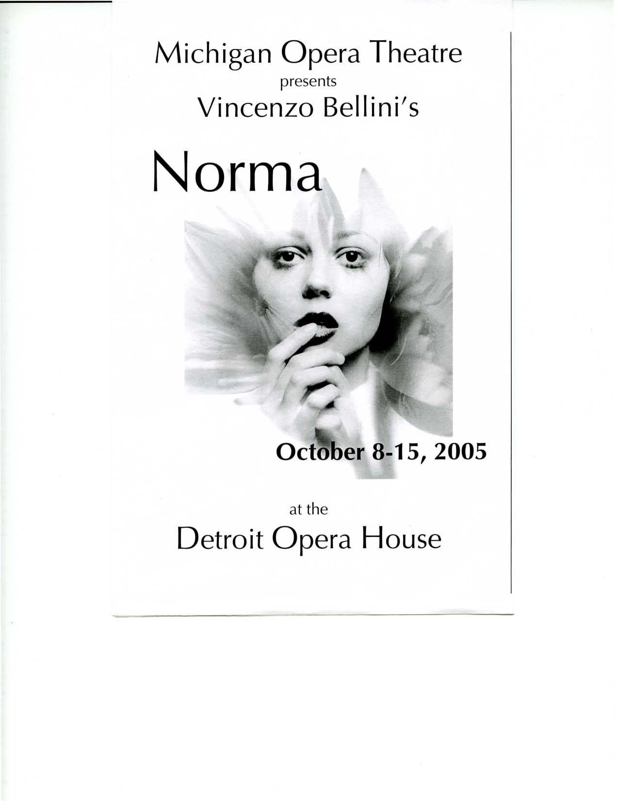 We begin the 2005 season, made possible by the generous sup port ofFord Motor Company; wi th Bellinis great bel canto masterpiece, Norma. Absent from our repertoire for more than a decade, Norma graces the grand stage of the Detroit Ope ra House for the first time. Replete with so m e of the most beautiful music in the operat ic catalogue and one of operas most desperate divas, it is a tale of tragic love , which will ce rtainl y leave you breathless.