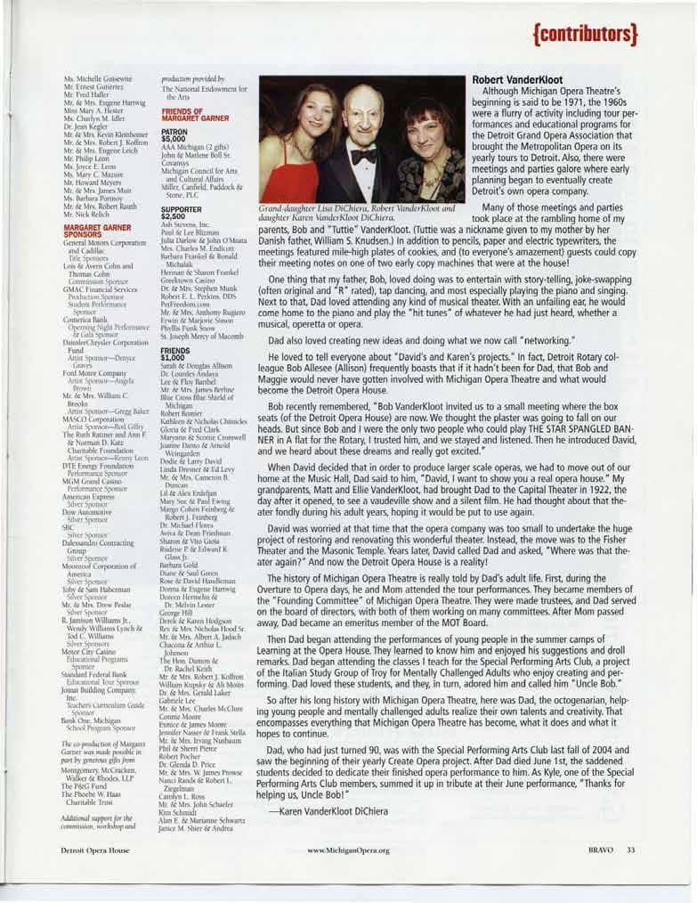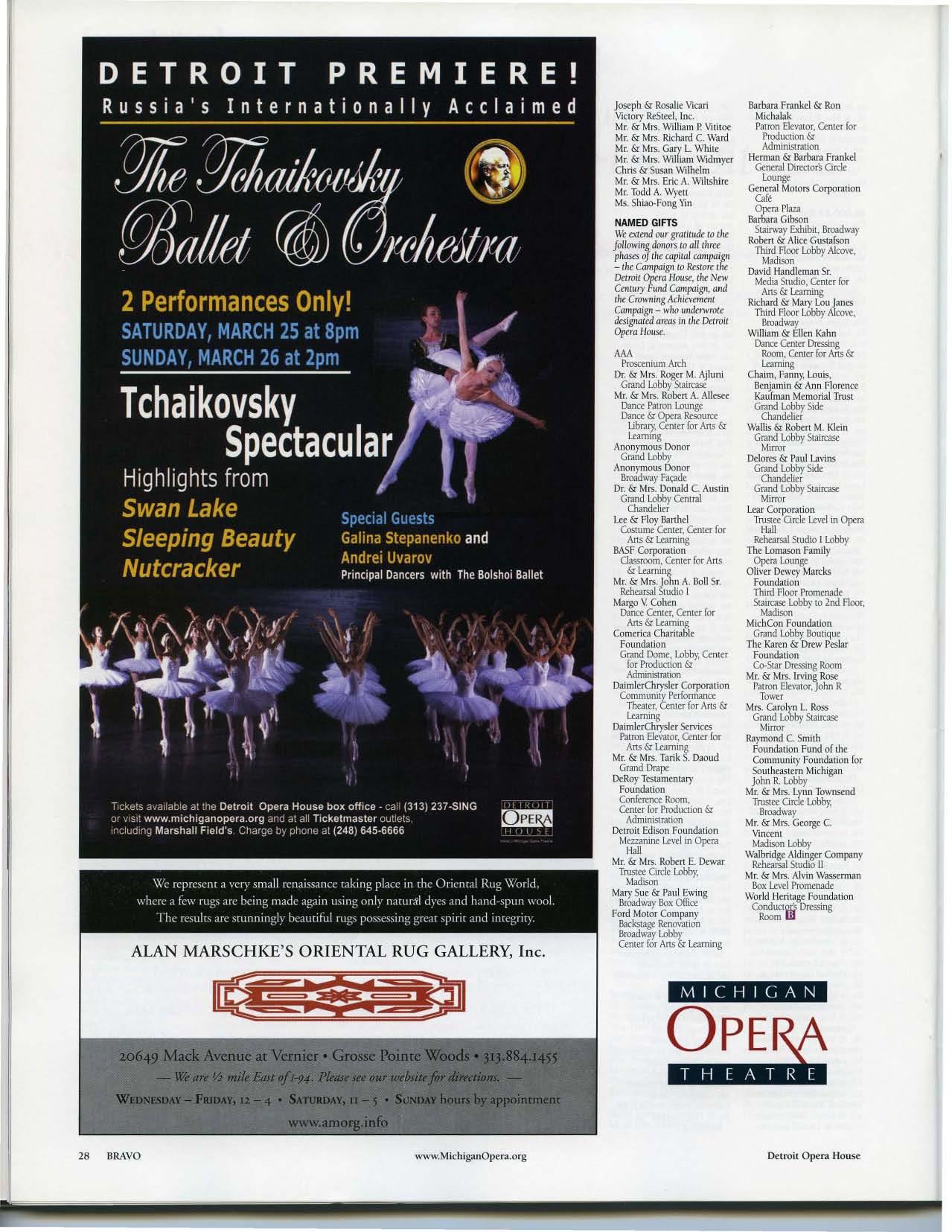 score I extend my deepest gra titude to the Ford I take special pride in noting a couple of steps Moto r Compan y, DaimlerChrysler, Margo into a very bright future for Michigan Opera Cohen , David and Marion Handleman, Lee Theatre. The completion of our final capital and Floy Barthel, Maggie Allesee and all those 4