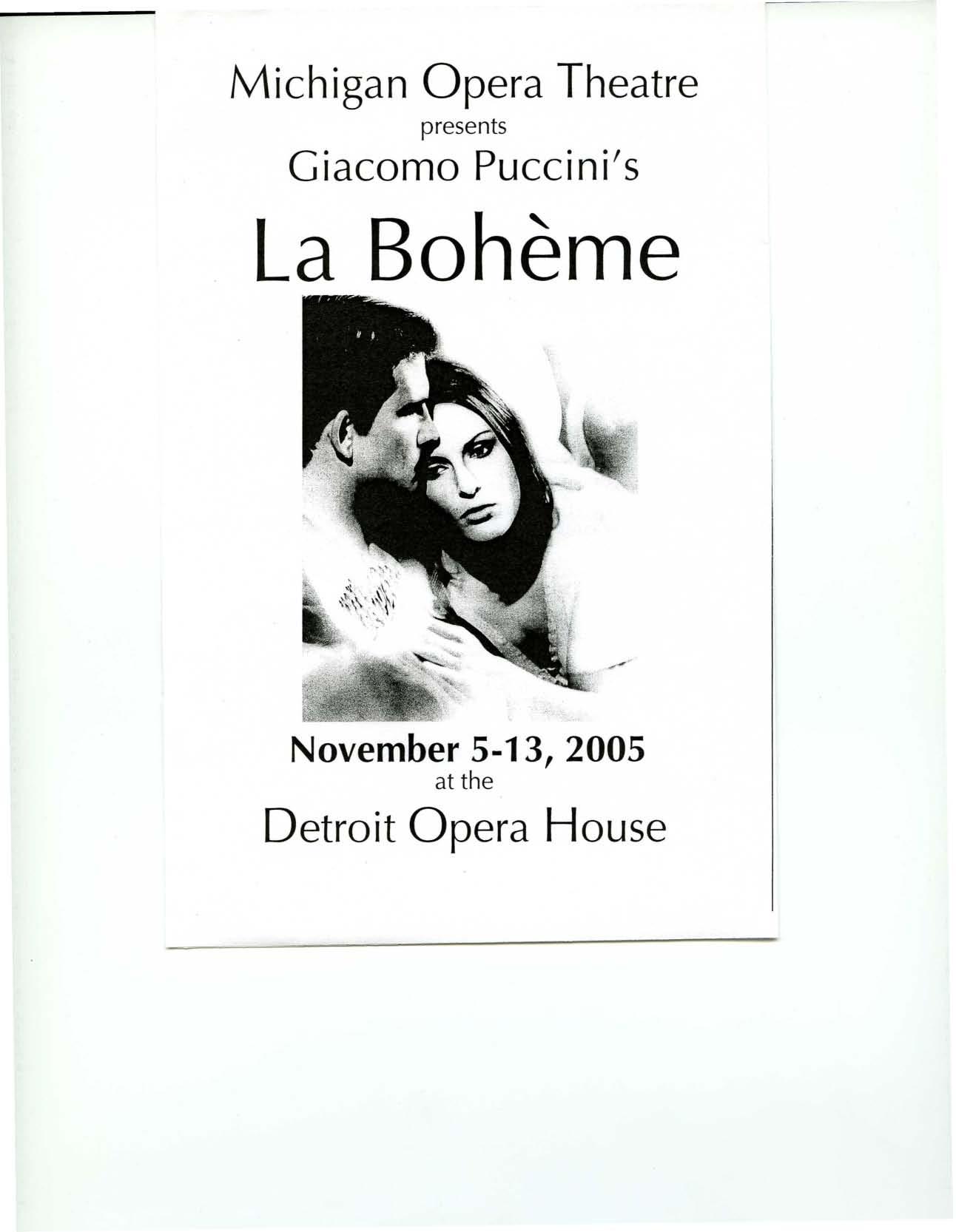 We'll close the 2005 fall opera season with a perenni al favo ri te; Puccinis La Boheme. Without a doubt, La Boheme is one of the grea test love stories ever sung and one of ope ra's most end earing tragedies. Puccinis librettists, Giacosa and Illica, saw fit to give the opera a tru l y d esperate diva in Mimiin fact, a cast of desperate bohemians-and for his part , the composer produced a score so ap t with the emotions o flo ve and loss that La Boheme remains as relevant and enticing today as it was at its premiere , more than a century ago.