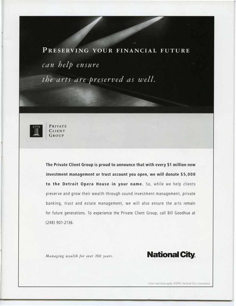 The Private Client Group is proud to announce that with every $1 million new investment management or trust account you open, we will donate $ 5,000 to the Detroit Opera House in your name. So, while we help clients preserve and grow their wealth through sound investment management, private banking, trust and estate management, we will also ensure the arts remain for future generations To experience the Private Client Group, call Bill Goodhue at (248) 901 -2136.