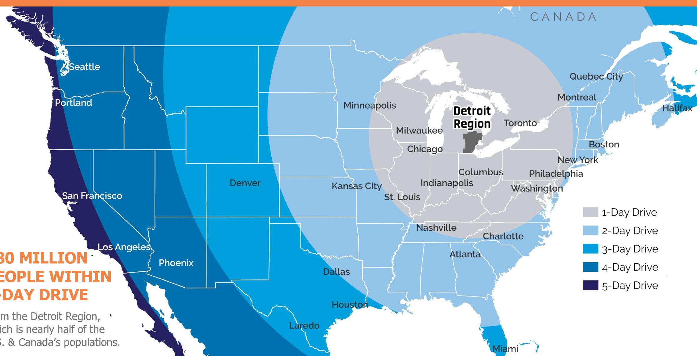 The Detroit Region holds a prominent and strategic position in the heart of North America. It is a gateway for trade, manufacturing and transportation. Located in the Midwest, Detroit is at the confluence of major international and domestic trade routes.