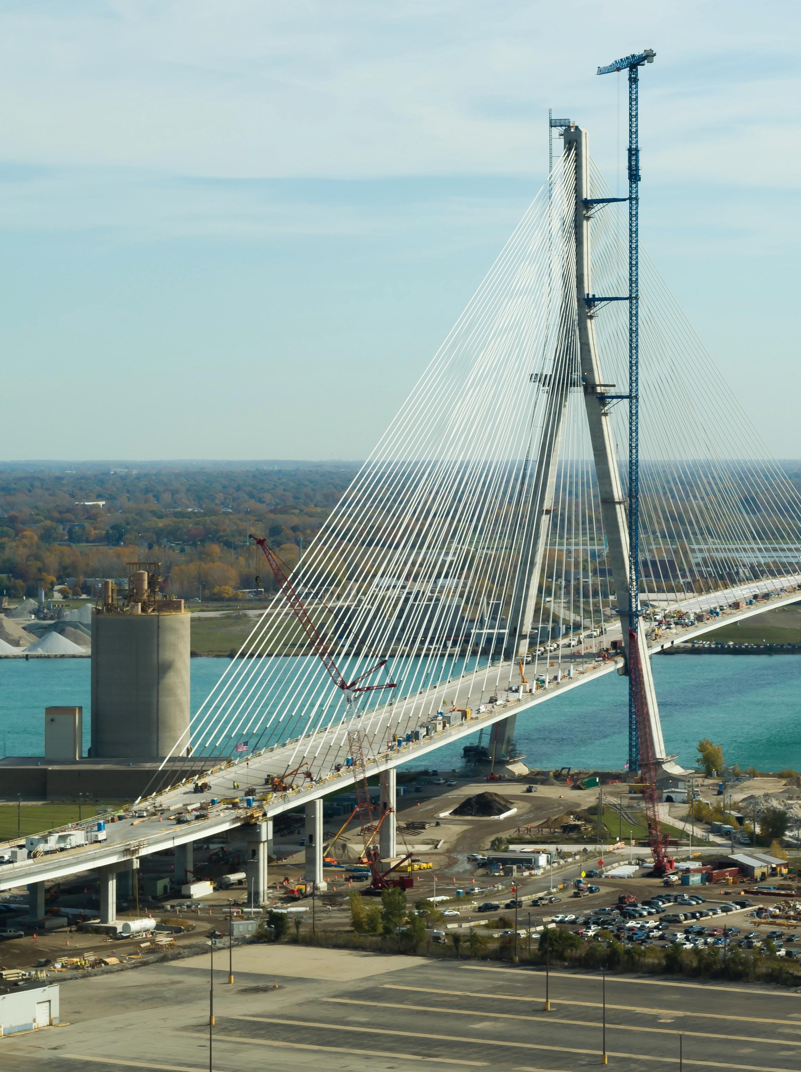 The Gordie Howe Bridge is set to open in 2025. This new international border crossing is a collaboration between the State of Michigan and the Ontario, Canada government. In addition to facilitating trade traffic, the bridge will feature a multi-use path for pedestrians and cyclists.