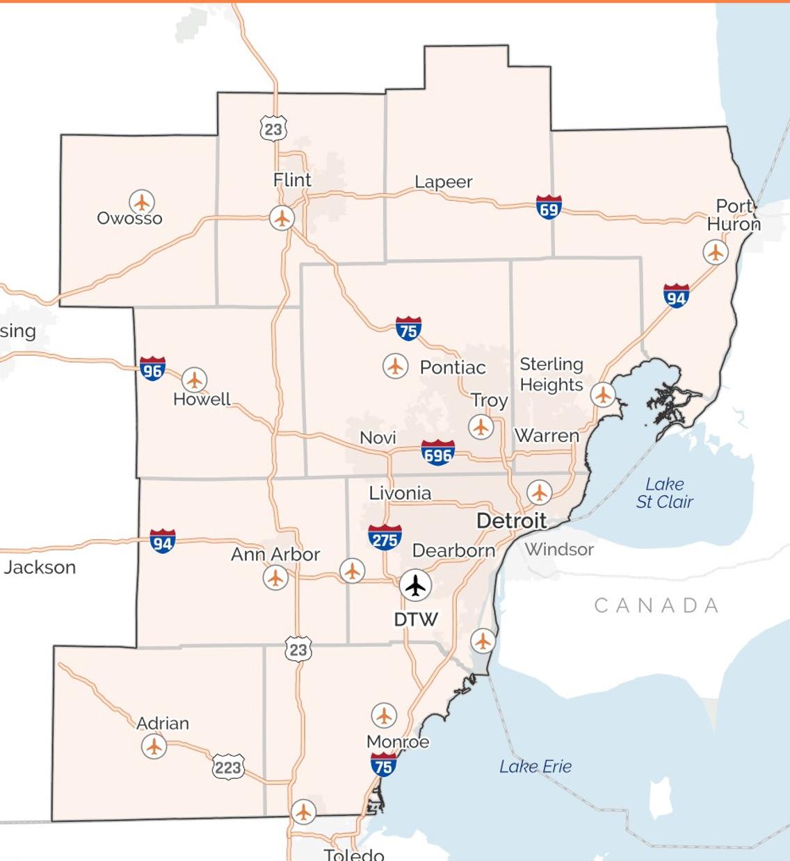 The Detroit region boasts one of the largest and most highly skilled workforces in the U.S., with 2.6 million workers, specializing in engineering, manufacturing, and technology. We are a hub of innovation, with a deep-rooted legacy in designing, engineering, and building the world’s most advanced products. Our strategic location at the heart of North America connects you directly to key markets, including seamless access to Canada through five international border crossings. Additionally, our world-class airport offers direct connections to 140 domestic and international destinations, ensuring global reach for your business.