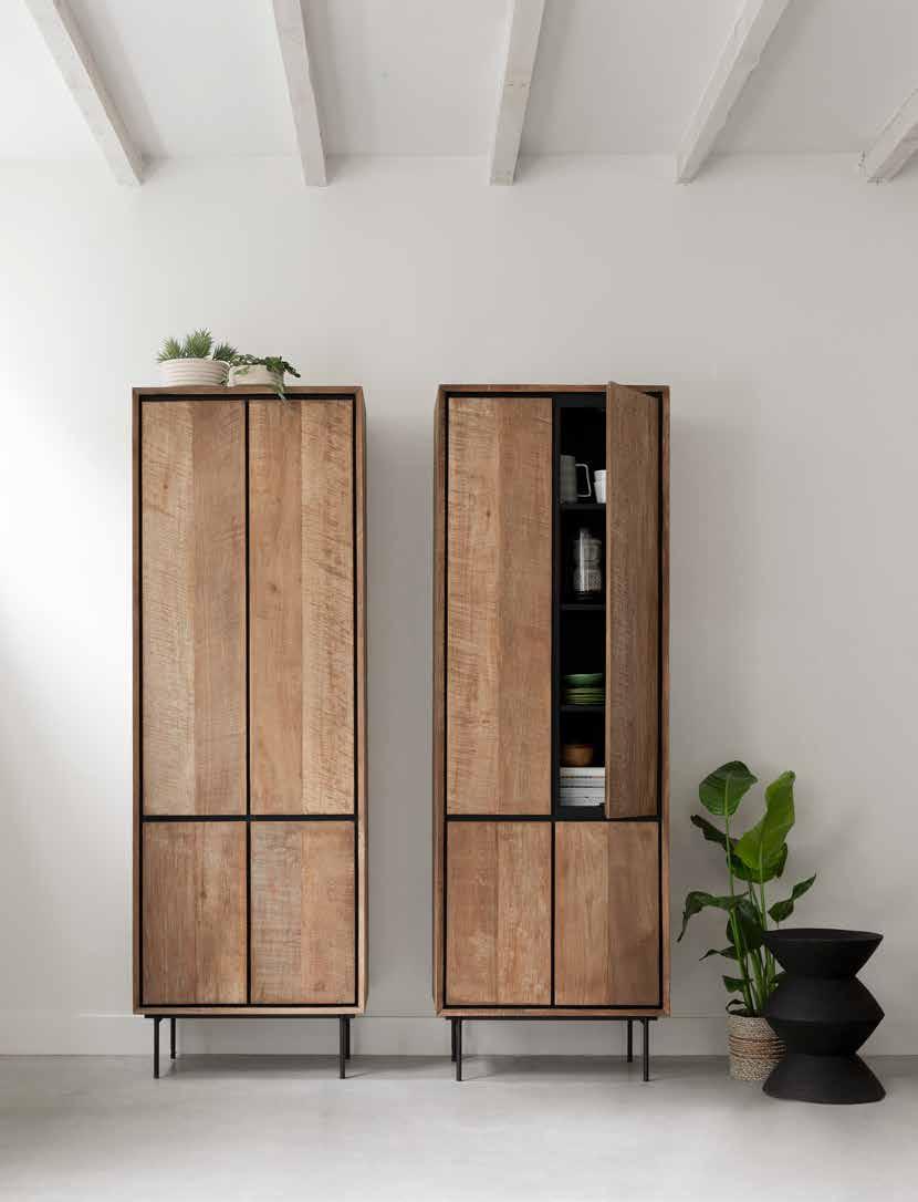 De deuren van dressoir Bogor bestaan uit verschillende diktes teakhout die in een grafisch patroon zijn gelegd. De structuur van het teakhout is zichtbaar gebleven en speelt met het licht. Wandpaneel Elyn is gemaakt van hergebruikt jute. Doordat alles één kleur heeft valt de structuur en het patroon van het materiaal nog meer op.