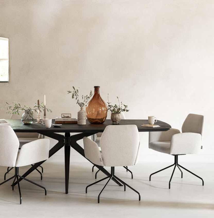 Eetkamerstoel Lauper is een royale stoel, perfect voor avondenlang tafelen. Dankzij het auto-return mechanisme draait hij altijd terug in zijn oorspronkelijke stand.