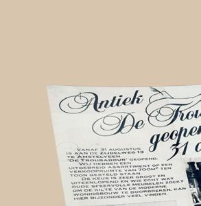 Troubadour Interieurs ‘Op 31 augustus 1995 opende ik de deuren van Troubadour Antiek en verkocht hier ‘gezellige meubelen’. Dag en nacht was ik bezig: ik kocht de meubels in, stelde ze op, verkocht ze en bracht ze in de avond met een vrachtwagen naar de klanten. Het heeft de basis gelegd voor wat wij nu, 30 jaar later, nog steeds doen: onze klanten blij maken met hun interieur.’
