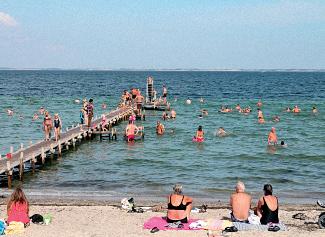 Einer besten Strände Südfyns mit Badebrücke und blauer Flagge.