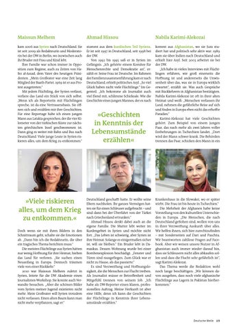 kam 2006 aus Syrien nach Deutschland. Sie ist seit 2009 als Redakteurin und Moderatorin bei der DW in Berlin, wo inzwischen auch ihr Bruder mit Frau und Kind lebt. Ihre Familie war schon immer in Opposition zum Regime, auch zu Zeiten von Hafez al-Assad, dem Vater des heutigen Präsidenten. „Mein Großvater war eine Zeit lang Mitglied der Baath-Partei. 1969 ist er aus Protest ausgetreten.“ Mit jedem Flüchtling, der Syrien verlässt, verliere das Land ein Stück von sich selbst. „Wenn ich als Reporterin mit Flüchtlingen spreche, ist da eine Vertrauensbasis. Sie öffnen sich und erzählen mir ihre Geschichten. Für eine Reportage habe ich einen jungen Mann aus Latakia gesprochen, der die vier Kilometer von der türkischen Küste zur nächs ten griechischen Insel geschwommen ist. Dann ging es weiter mit Bahn und Bus nach Deutschland. Viele junge Leute in Syrien riskieren alles, um dem Krieg zu entkommen.“