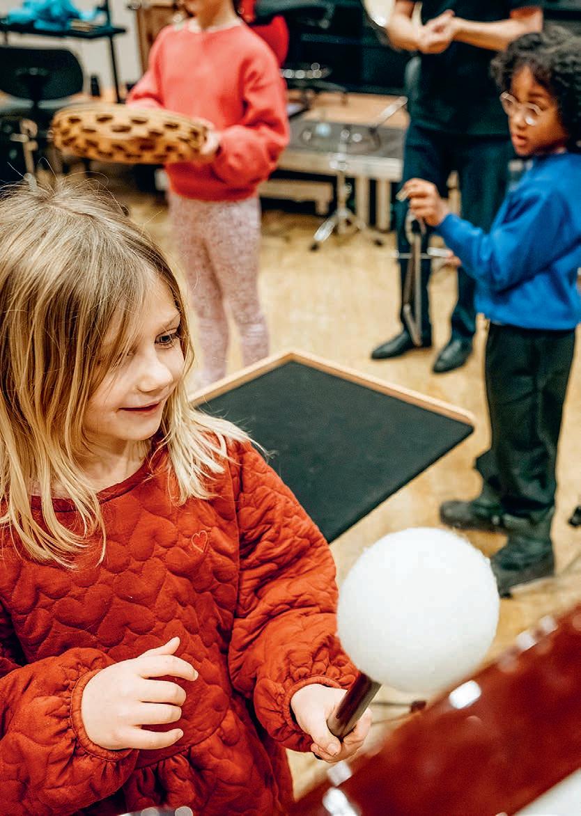 Im Projekt stelle ich Kindern unter anderem Pauken und Becken vor, kleine und große Trommel, Xylophon, Glockenspiel, Marimba, Triangel und Tamburin. Ich zeige, wie man die Instrumente spielt, und alle dürfen eines ausprobieren – unterstützt von der Gruppe, die dazu klatscht und stampft. Das macht am meisten Spaß! Besonders überraschen oft die Röhrenglocken und die Body Percussion, wenn der eigene Körper Beats erzeugt. Trommeln ist etwas Archaisches. Laut sein, etwas spüren, Rhythmen erzeugen, das existiert in jeder Kultur. »Krawumm« zeigt darüberhinaus, dass man für Rhythmus auch Disziplin braucht, Gefühl und Balance: Die Übung macht den Meister. Und dazu ist die sinnliche Erfahrung wichtig: learning by doing.