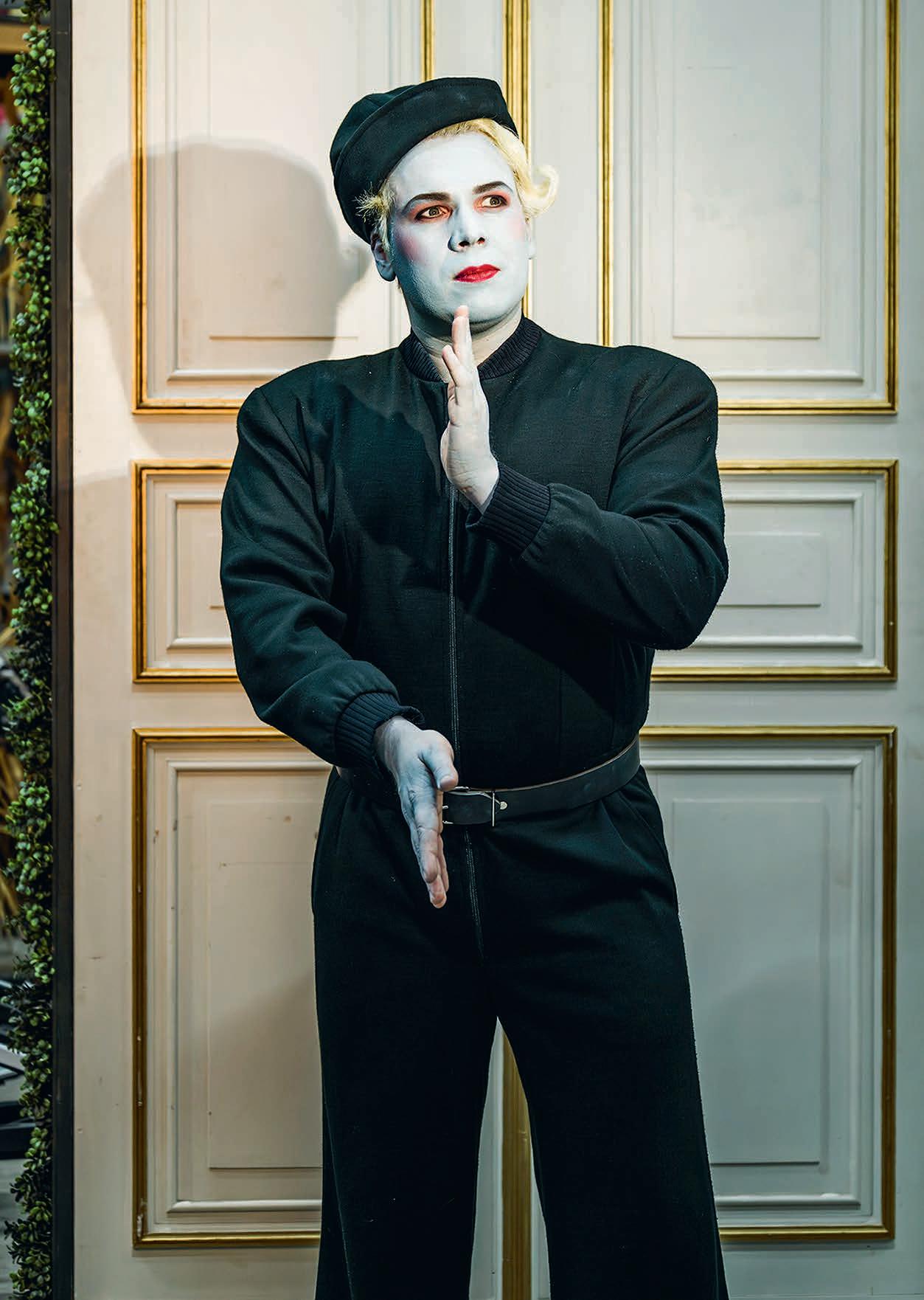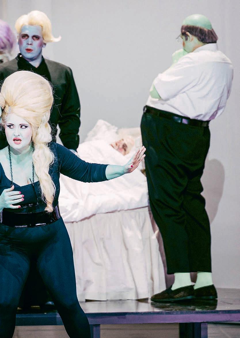 GIANNI SCHICCHI ist die ungewöhnlichste Produktion, an der ich je mitgewirkt habe. Allein schon unser Look: Wir sehen aus wie eine Comicversion der »Addams Family«, sind ständig in Bewegung und Interaktion. Ich muss auf meine Kollegen achten, sobald wir einander berühren, würden unsere Masken abfärben, wir sind ja in unterschiedlichen Farben geschminkt. Ich bin blau, viele sind grün, Gherardo und Lauretta (in sie bin ich verliebt) sind knallrot, hinzu kommen große, farbige Perücken – es ist ein Spaß. Mimik und Spielstil haben wir bei den Proben mit Regisseurin Pınar Karabulut entwickelt. Ich kann meiner albernen Seite freien Lauf lassen, ich komme ja vom Musical. Musik und Inszenierung sind so energetisch, dass wir alle nach den Aufführungen schnell in die Kantine gehen, um zu reden und weiter Spaß zu haben. Die meisten von uns haben dann noch den einen oder anderen Fleck auf der Haut – Theaterschminke ist hartnäckig.