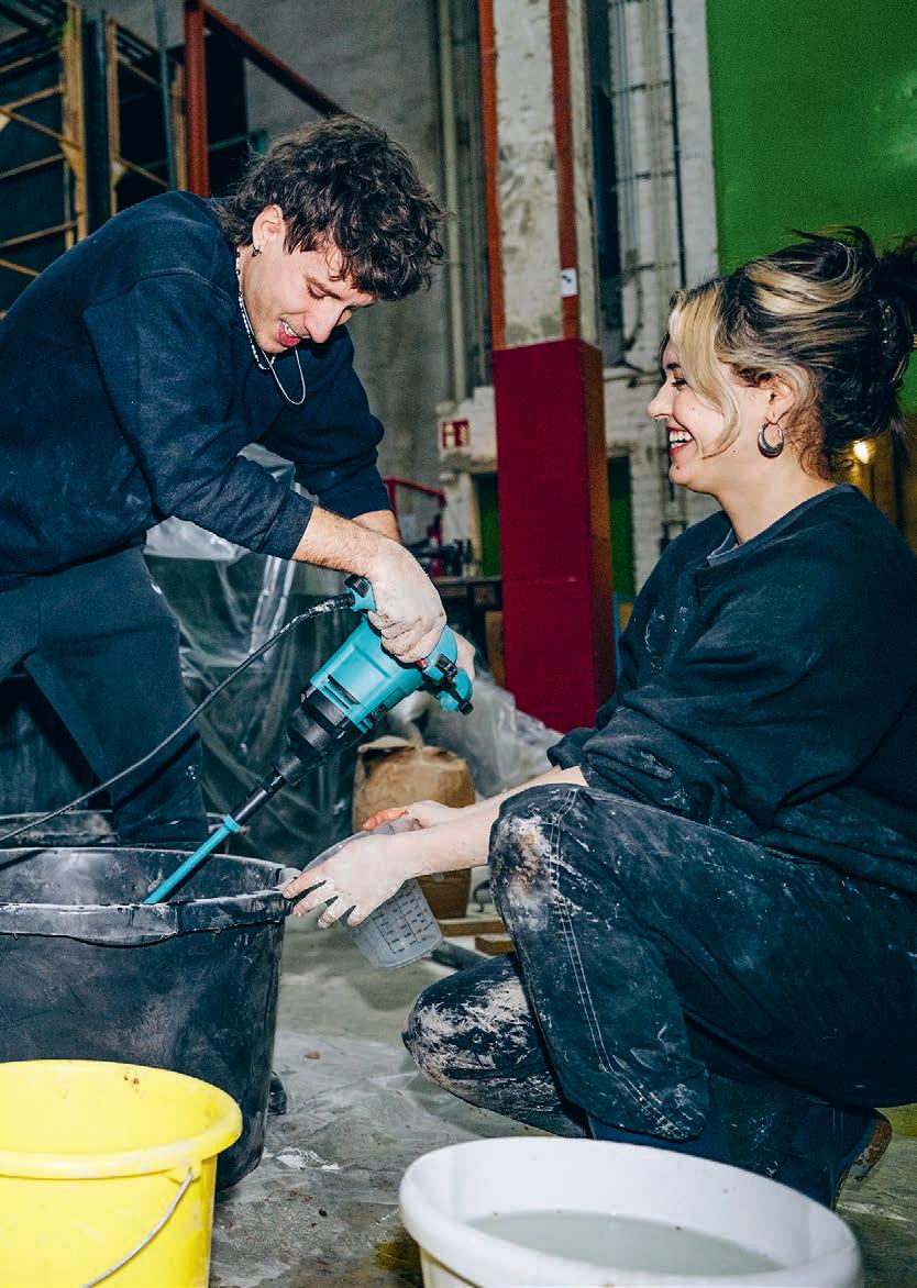 Praktikantin Amber Jäger und Bühnenbildassistent Noah Ebert Gómez mischen kosmetische Heilerde mit Wasser und Korkgranulat zu volumigem Theaterlehm