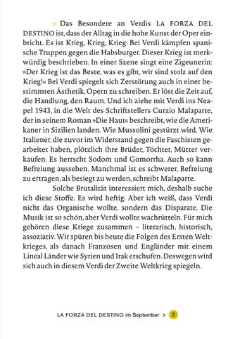 bricht. Es ist Krieg, Krieg, Krieg. Bei Verdi kämpfen spanische Truppen gegen die Habsburger. Dieser Krieg ist merkwürdig beschrieben. In einer Szene singt eine Zigeunerin: »Der Krieg ist das Beste, was es gibt, wir sind stolz auf den Krieg!« Bei Verdi spiegelt sich Zerstörung auch in einer bestimmten Ästhetik, Opern zu schreiben. Er löst die Zeit auf, die Handlung, den Raum. Und ich ziehe mit Verdi ins Neapel 1943, in die Welt des Schriftstellers Curzio Malaparte, der in seinem Roman »Die Haut« beschreibt, wie die Amerikaner in Sizilien landen. Wie Mussolini gestürzt wird. Wie Italiener, die zuvor im Widerstand gegen die Faschisten gearbeitet haben, plötzlich ihre Brüder, Töchter, Mütter verkaufen. Es herrscht Sodom und Gomorrha. Auch so kann Befreiung aussehen. Manchmal ist es schwerer, Befreiung zu ertragen, als besiegt zu werden, schreibt Malaparte. Solche Brutalität interessiert mich, deshalb suche ich diese Stoffe. Es wird heftig. Aber ich weiß, dass Verdi nicht das Organische wollte, sondern das Disparate. Die Musik ist so schön, aber Verdi wollte wachrütteln. Für mich gehören diese Kriege zusammen – literarisch, historisch, assoziativ. Wir spüren bis heute die Folgen des Ersten Weltkrieges, als danach Franzosen und Engländer mit einem Lineal Länder wie Syrien und Irak erschufen. Deswegen wird sich auch in diesem Verdi der Zweite Weltkrieg spiegeln.