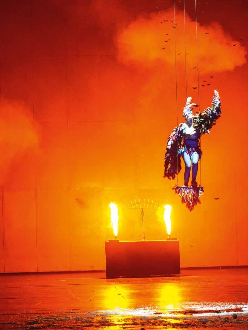 Unter der Bühne geht es sechs Meter abwärts – was zum Beispiel überraschende Chorauftritte aus der Tiefe möglich macht. Sechs Podien lassen sich einzeln fahren, Tischversenkungen bieten die Möglichkeit für Auftritte aus dem Bühnenboden, und eine Flugmaschinerie gibt es obendrein. Wir präsentieren Ihnen die Bühne als Star – der für diesen Anlass natürlich ins rechte Scheinwerferlicht gesetzt wird! Wenn dann von der Seite noch Nebelschwaden aufziehen, wird es vielleicht sogar ein wenig gruselig.