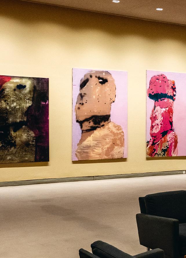 In den Foyers der Deutschen Oper Berlin stellt die Malerin Tatjana Doll Werke aus ihrer Serie »DummyAkku-Akku« aus. Die Abbilder mythischer Moai-Statuen schützen das Treiben im Opernsaal