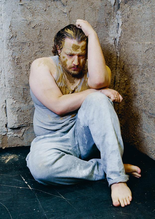 Für meine Verwandlung sitze ich fünf Minuten in der Maske, wir beschmieren mich mit Heilerde – fertig. Zu Florestan werde ich jedoch nicht erst dort. Es ist ein Prozess, der mit der ersten Recherche beginnt, ein geistiges Durchdringen und Abstrahieren, das zu einem instinktiven körperlichen Erleben wird, sobald ich die Bühne betrete. Der Lehm hilft mir dabei: Er lässt mich die Entmenschlichung spüren, mich langsam mit der Architektur des Gefängnisses und seiner Logik verschmelzen.