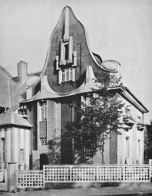 Worauf die Scharoun-Forschung noch nicht ein gegangen ist, ist der Einfluss des Jugendstils, dem sich der junge Scharoun nicht entziehen konnte. Die ab 1900 in Darmstadt auf der Mathil denhöhe unter Federführung des Wiener Archi tekten Josef Maria olbrich errichtete Siedlung, die in allen zeitgenössischen Bauzeitschriften besprochen wurde, wird ihm bekannt gewesen sein. 24 Bereits die ersten, mit Baunummern ver sehenen Zeichnungen lassen seine individuelle