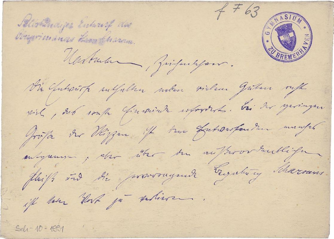 1991 (Vorder- und Rückseite, Abb. S. 30, 16): „Hartmann, Zeichenlehrer. Die Entwürfe enthal ten neben vielem Guten recht viel, das ernste Einwände erfordert. Bei der geringen Größe der Skizzen ist dem Entwerfenden manches ent gangen; aber über den außerordentlichen Fleiß und die hervorragende Begabung Scharouns ist kein wort zu verlieren“.16