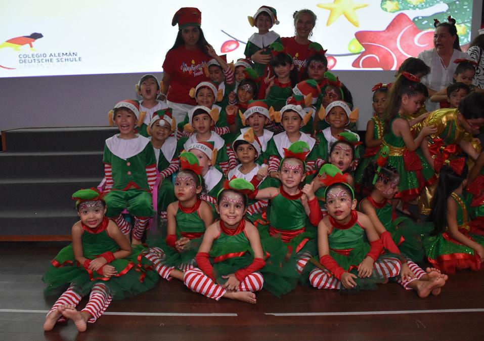 Luego, Kinderkrippe fue toda una fiesta en la que gozaron arbolitos de Navidad; cascanueces y bailarinas; hombrecitos de nieve y galletas de jengibre. Prekínder y Kínder no se quedaron atrás y nos contagiaron del espíritu decembrino con los elementos de estas fiestas: campanas, renos, flores, estrellas, bastones, elfos, regalos y luces, ¡toda una explosión de colorido y alegría!