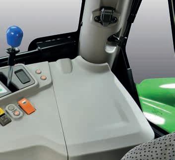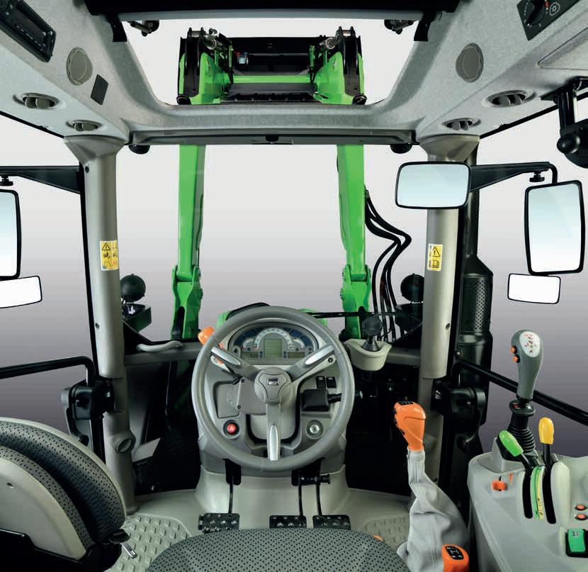 O novo modelo de trator DEUTZ-FAHR Série 5 Keyline está equipado com uma cabina confortável. Uma caraterística importante da cabina do DEUTZ-FAHR 5 Keyline é a sua construção com apenas 4 pilares, o que a torna confortável e prática. A cabina apresenta um design avançado e moderno, com uma janela espaçosa e um perfil atraente do capot monolítico que garante uma visibilidade fantástica em todas as condições. Mesmo em condições de pouca luminosidade, a visibilidade permanece perfeita, graças às 12 potentes luzes de trabalho que apoiam todas as atividades. A nova cabina TopVisionevo está sempre suspensa sobre Hydro Silent-Blocks, o que garante um excelente conforto, reduzindo as vibrações até 40%. A coluna de direção regulável em altura e profundidade, juntamente com o banco suspenso com múltiplas regulações, permite que os operadores de qualquer altura encontrem a sua posição perfeita para as atividades de transporte no campo e na estrada. Para maior conforto, o rádio está incluído de série. Baixos níveis de ruído e controlos intuitivamente organizados criam um ambiente de trabalho excecionalmente confortável. Entre as opções de personalização da cabina encontra-se um suporte montado de fábrica para a montagem de um monitor ou de dispositivos adicionais para controlo do equipamento. Tem um banco de passageiro, várias tomadas elétricas e 2 portas USB; práticos suportes para smartphone e copo. O teto de abrir e o vidro traseiro asseguram uma excelente ventilação da cabina. O sistema de ar condicionado garante o conforto da cabina durante todas as estações do ano. 10 saídas de ventilação fornecem ar purificado em toda a cabina através de filtros específicos e mantêm um clima interior agradável.