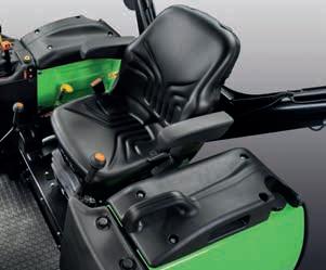 Para satisfacer las distintas necesidades operativas, todos los tractores de orugas DEUTZ-FAHR llevan de serie una caja de cambios principal mecánica de 4 marchas con 2 gamas, un inversor sincronizado y el OverDrive (16+16 relaciones). De manera opcional, los 5 K, 5 KM y 5 KF pueden equiparse con una caja de cambios 12+12 que incorpora una marcha lenta, lo que permite una velocidad mínima a partir de 0,43 km/h con el motor al máximo régimen. Tanto los embragues de dirección como los frenos en baño de aceite se accionan de forma gradual e individualmente en cada oruga, mediante un nuevo par de palancas de mando hidráulico servoasistido, integradas en una posición cómoda en el tablero. Tirando de cada una de las palancas hasta la mitad del recorrido se interviene en el embrague correspondiente, mientras que, si se supera este límite, entran en funcionamiento también los frenos. La TDF tiene de serie el eje intercambiable y el acoplamiento electrohidráulico con arranque progresivo. Para poder trabajar eficazmente con cualquier apero, la TDF trasera cuenta con las combinaciones 540 y 540ECO, pero, por encargo, para los modelos 5 KM y 5 K, hay disponible también una versión 540 y 1000.