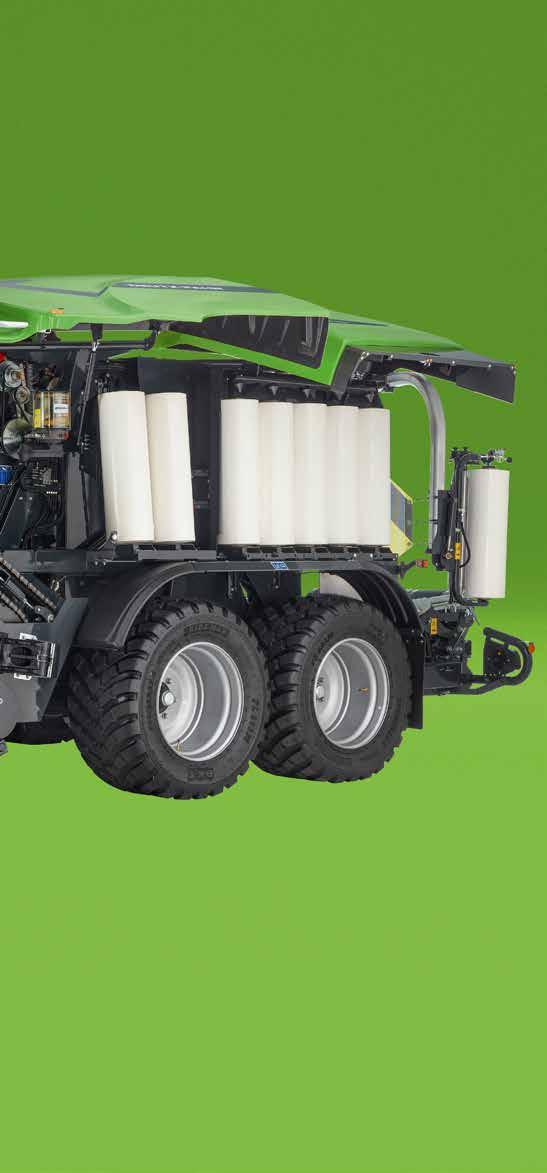 Il sistema di legatura a pellicola DEUTZ-FAHR utilizza due bobine standard di pellicola estensibile da 750 mm. L’utilizzo di una pellicola di fasciatura standard offre un rapporto di pre-tensionamento notevolmente superiore rispetto ai sistemi di legatura tradizionali con pellicola larga. I costi della legatura a pellicola si riducono così del 37% e prolunga gli intervalli di sostituzione di un ulteriore 30%.