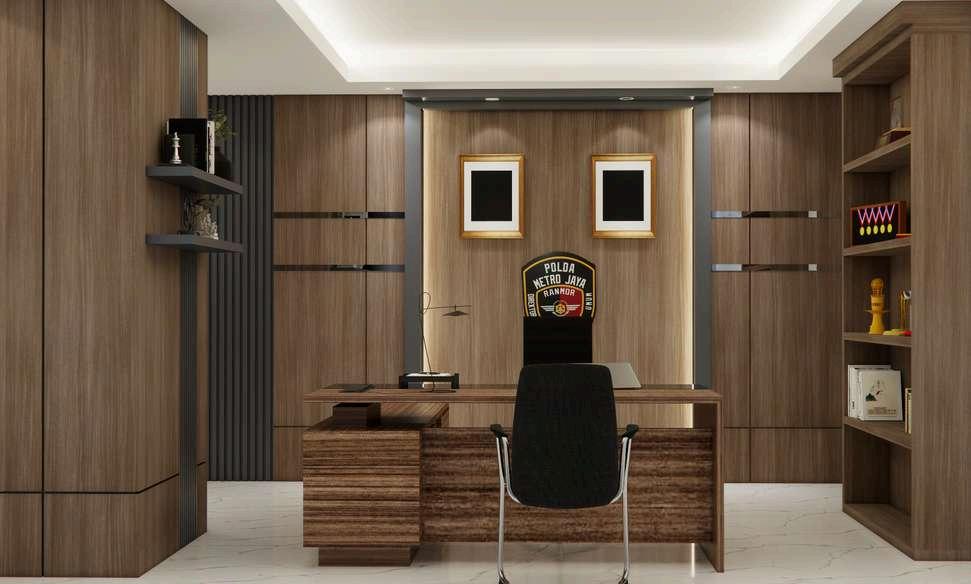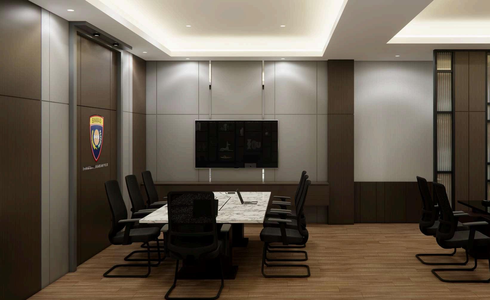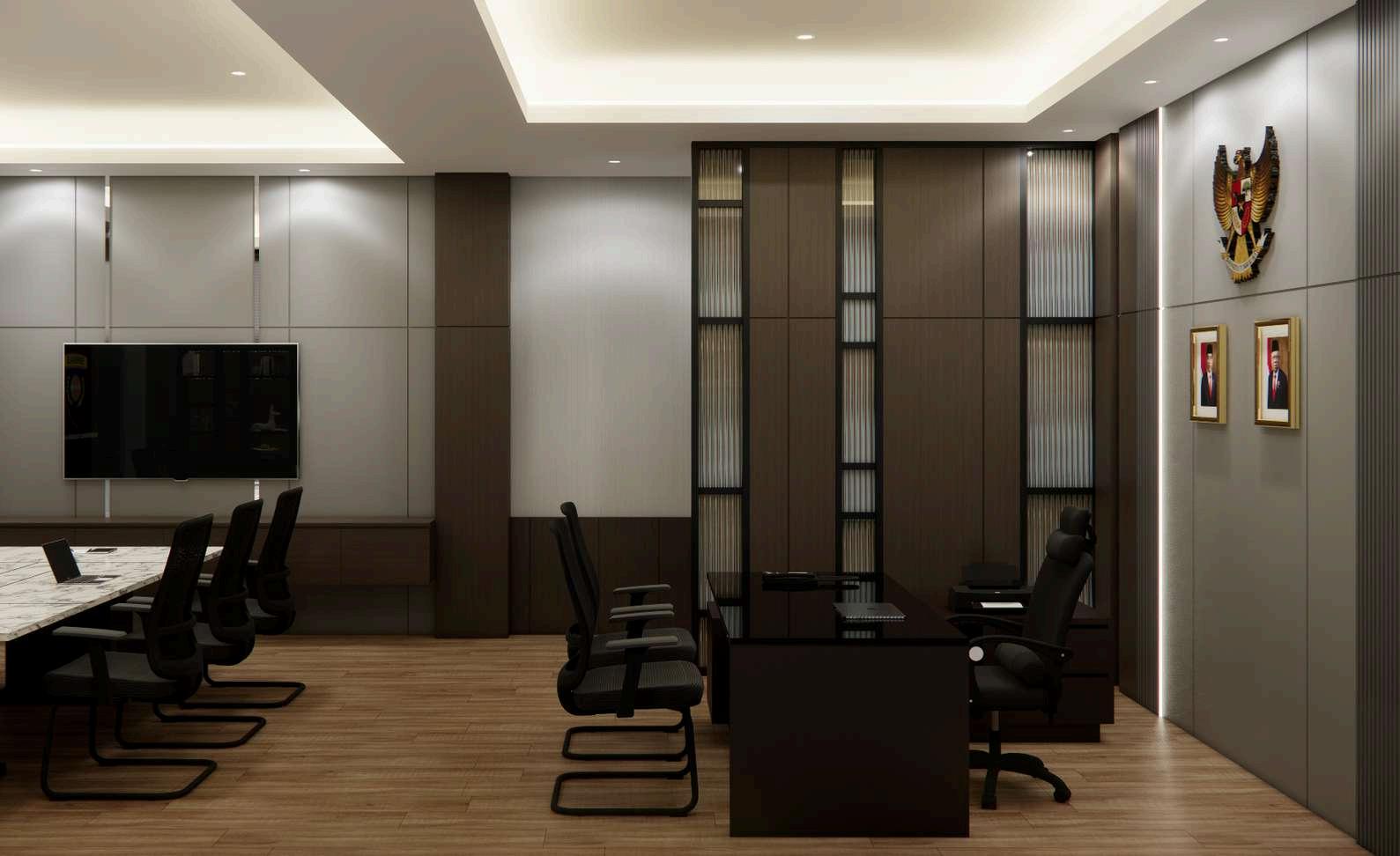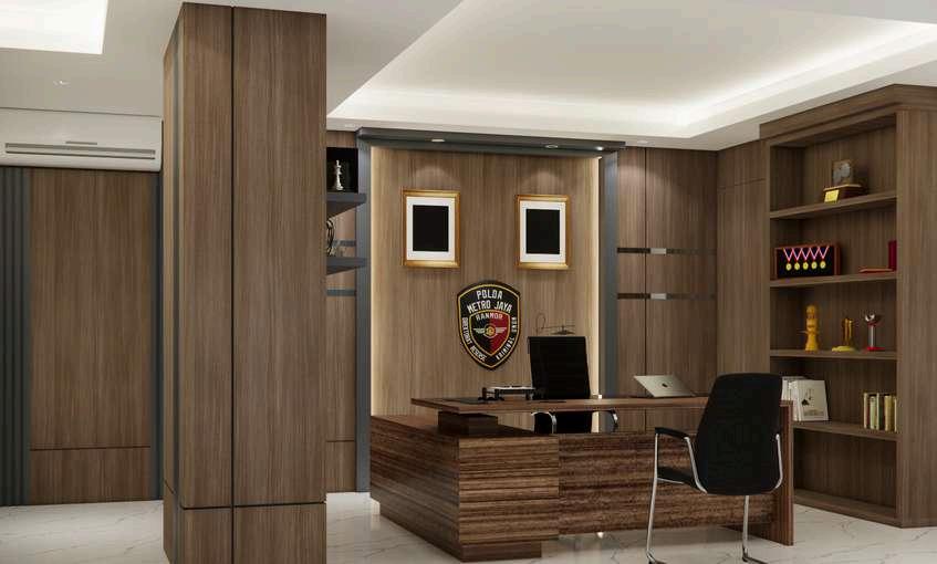Interior pada ruang Irjen Mabes Polri ini mengusung tema elegan dan modern dengan perpaduan warna cokelat, abu-abu, tua dan abu-abu muda menciptakan suasana yang nyaman profesional, dan berkelas Kesan pertama yang muncul pada ruang ini kombinasi sempurna antara kemewahan yang terorganisir dan kenyamanan yang fungsional. Wall panel yang terpasang pada setiap sudut ruang berfungsi sebagai elemen desain yang menambah nilai estetika pada ruang kerja serta terdapat partisi yang dirancang untuk menciptakan ruang privasi bagi Irjen Panel ini tidak hanya berfungsi sebagai dekorasi, tetapi juga memberikan nuansa yang lebih mewah dan formal Untuk memberikan kesan yang lebih elegan, wall panel menggunakan material kayu dengan warna netral seperti cokelat dengan perpaduan abu-abu tua dan abu-abu muda yang dipasang dengan rapih dan presisi menciptakan efek visual yang halus dan mewah. Ditambah dengan sentuhan aksen plat silver pada wall panel ruang ini semakin menghadirkan kesan penuh kehormatan