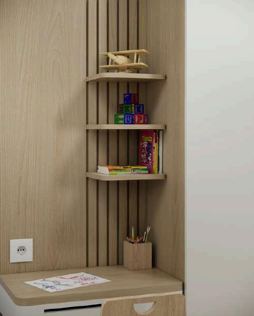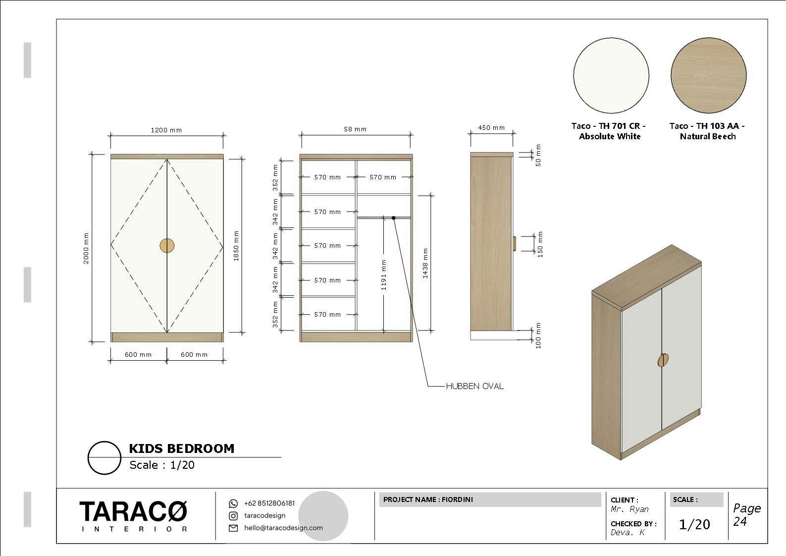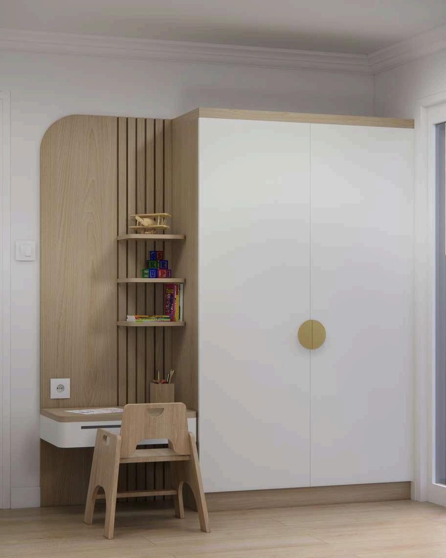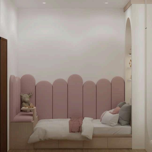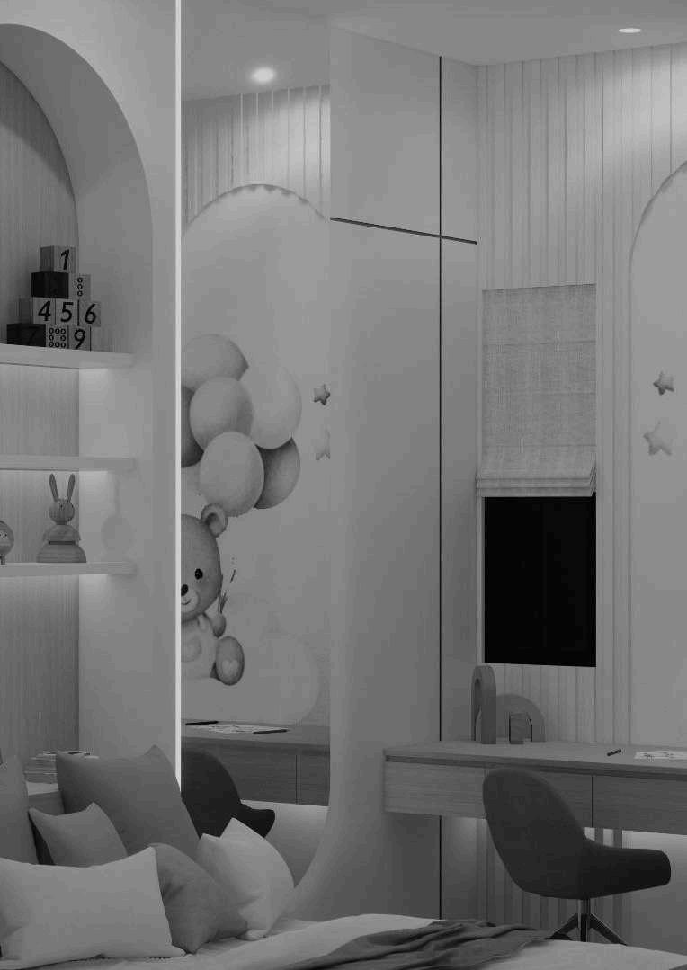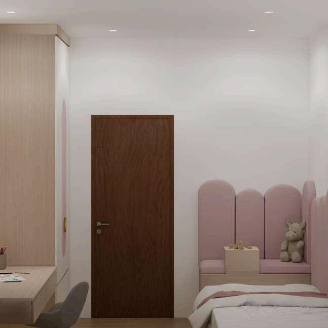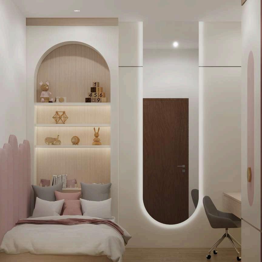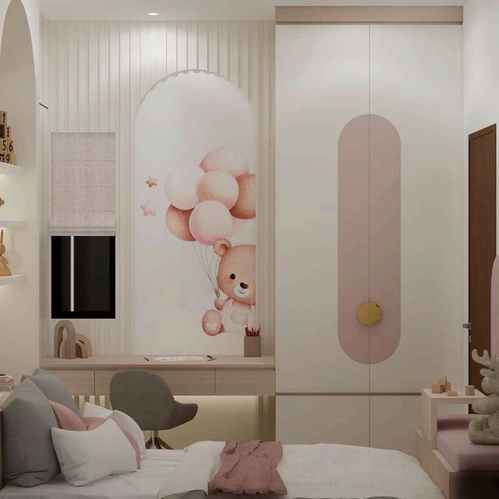 Kamar anak ini dirancang khusus untuk anak perempuan dengan mempertimbangkan kenyamanan dan keamanan Furniture yang ada di kamar ini disesuaikan dengan ukuran yang ideal untuk anak-anak terlihat pada tinggi meja belajar kursi belajar dan gagang pintu pada lemari baju Selain memperhatikan aspek ergonomis, kamar ini juga mengutamakan fungsionalitas seperti pada bagian bawah kasur yang dilengkapi dengan beberapa laci tarik untuk menyimpan mainan serta ambalan tambahan di atas kasur untuk menata koleksi mainan favorit anak Untuk menciptakan suasana yang ceria, kamar ini mengusung nuansa warna pink muda, cokelat muda dan putih yang serasi sesuai dengan request client. Material HPL bermotif kayu dan HPL berwarna putih memperindah tampilan, sementara wallpaper dengan desain yang lucu dan menyenangkan menambah keceriaan, sehingga anak dapat merasa bahagia dan nyaman saat berada di kamarnya