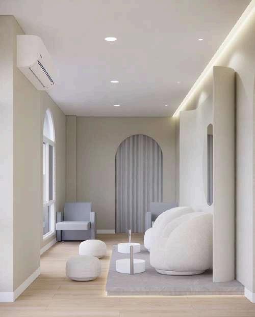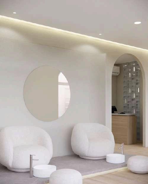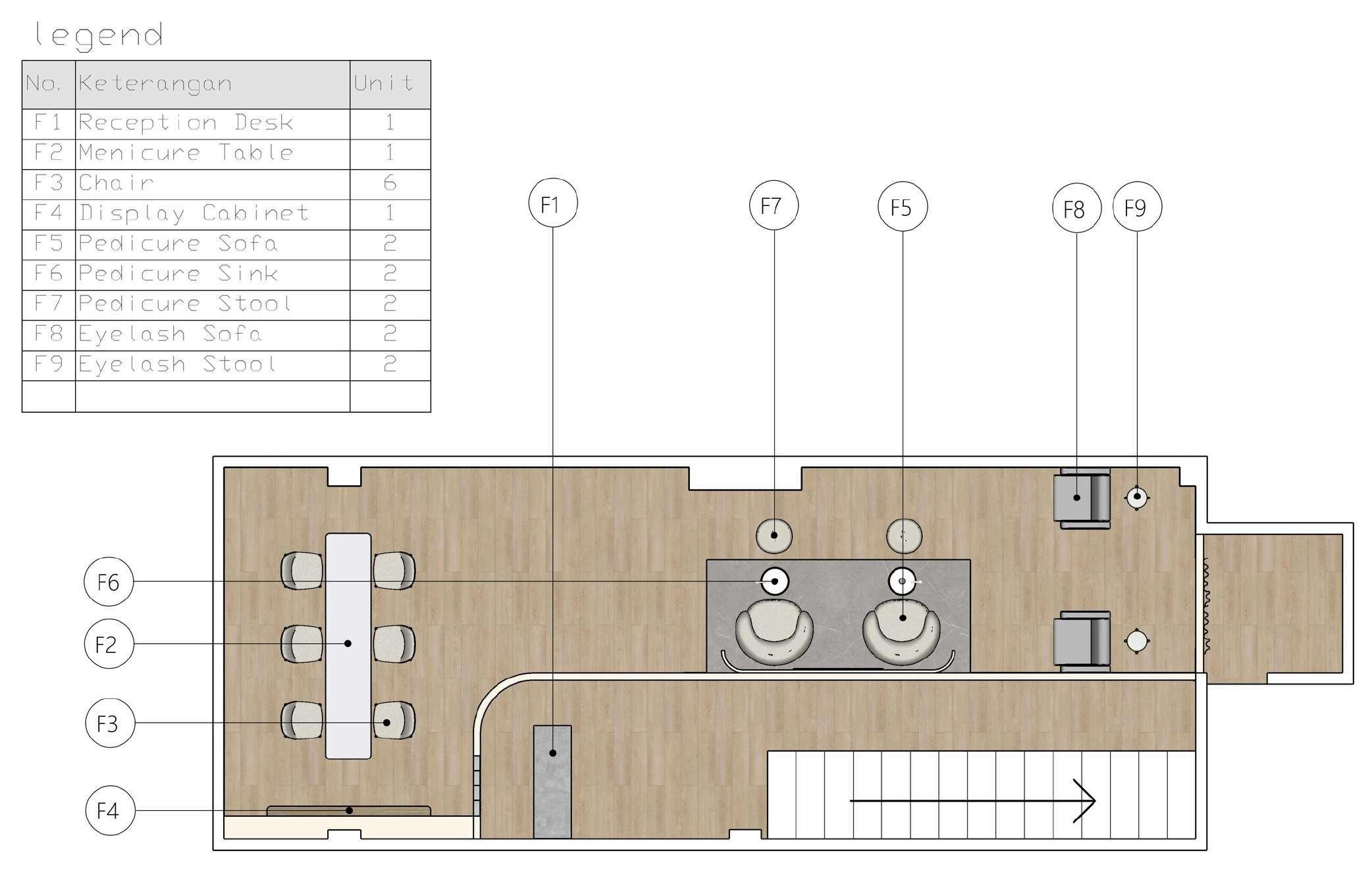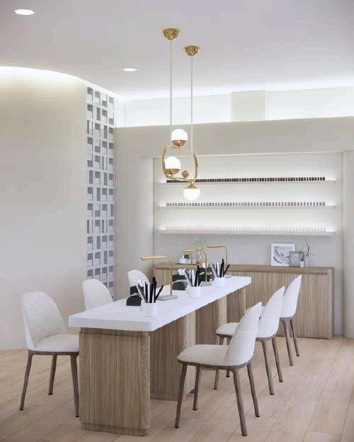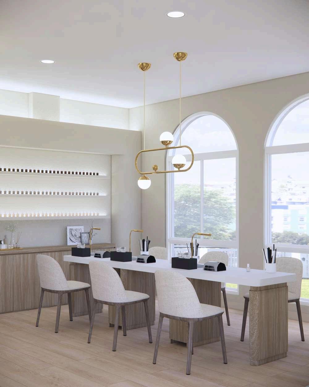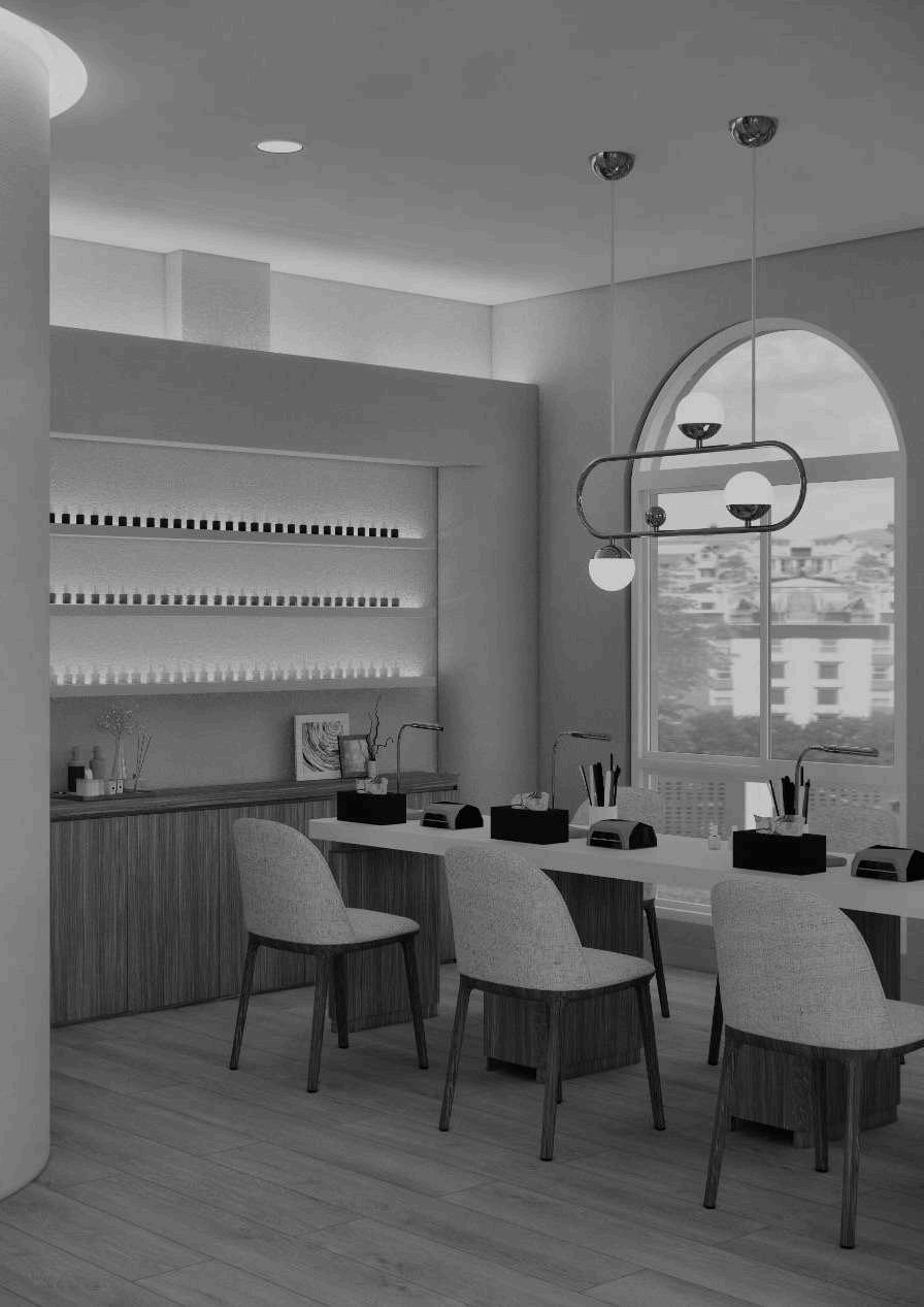 Nail salon ini dirancang dengan gaya clean dan memperhatikan aspek ergonomi bertujuan untuk menciptakan ruang yang tidak hanya estetik, tetapi uga nyaman dan fungsiona bagi pengunjung dan staf Desain clean mengutamakan kesederhanaan kebersihan dan keteraturan dengan penggunaan palette warna netral seperti putih abu-abu, beige, dan aksen kayu atau gold untuk memberikan kesan modern dan tenang Pemi ihan warna netral dan cerah memberikan kesan luas dan bersih Lampu LED dengan warna hangat bisa digunakan untuk memberi suasana santai sementara pencahayaan task-lighting dengan warna cold yang lebih fokus pada area kerja Kursi dan mea untuk pelanggan serta pekera dirancang dengan prinsip ergonomi untuk memastikan kenyamanan dalam durasi yang panjang Serta tata letak ruang yang terbuka dan terorganisir dengan baik terpisah secara elas, namun tetap terhubung dengan lancar