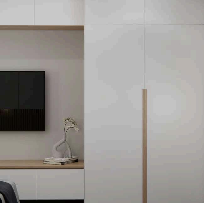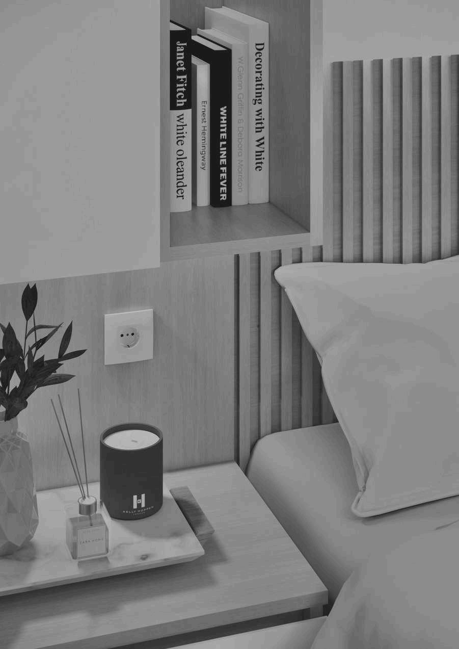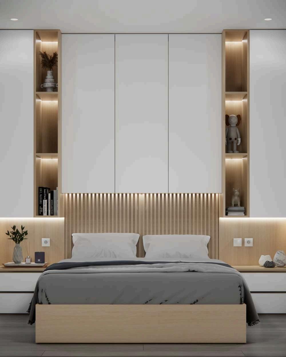 Master bedroom ini memiliki gaya interior japandi yang dimana dominan warna cokelat dengan motif kayu dan paduan warna putih Gaya japandi ini dapat menghasilkan suasana ruangan yang membuat pengguna dapat relax dan dapat menenangkan sehingga cocok untuk diaplikasikan pada master bedroom Selain itu master bedroom ini juga memiliki space yang cukup kecil sehingga diperlukannya inovasi dalam penyimpanan barang-barang pengguna Maka, di master bedroom ini dibuatkanlah furniture built-in yang menyesuaikan bentuk dan ukuran dari ruangan ini sehingga setiap space pada ruangan ini dapat dimanfaatkan sebaik-baiknya Beberapa furniture built-in yang terdapat pada master bedroom ini yaitu lemari baju tv cabinet yang nyambung dengan meja rias sekaligus mea kerja serta beberapa storage tambahan pada bagian atas kasur yang dilengkapi dengan side table di sisi kanan dan kiri kasur