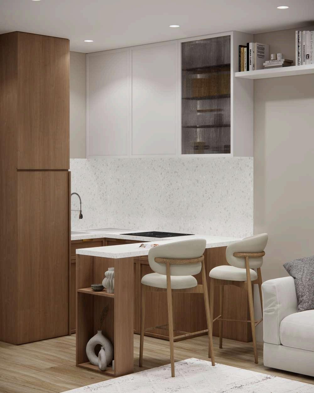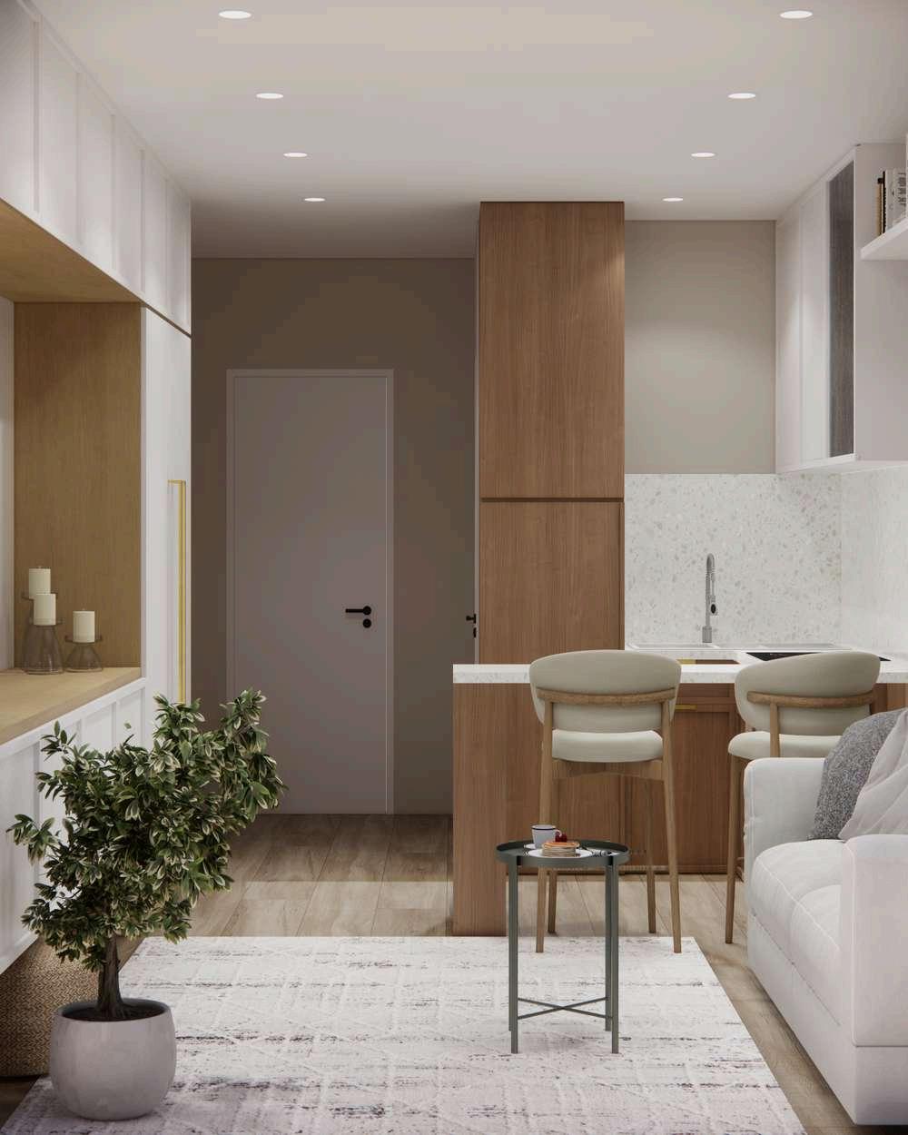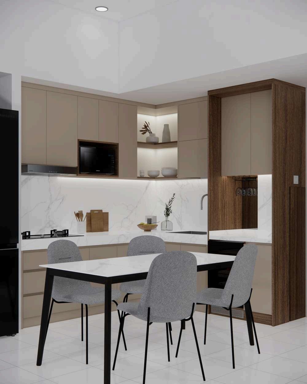 Living room dan kitchen ini merupakan kombinasi antara estetika Jepang yang tenang dan sederhana dengan sentuhan Skandinavia yang hangat dan ramah serta kepraktisan dapur yang sederhana dan elegan sekaligus memiliki penyimpanan yang rapi dan terorganisir untuk menciptakan ruang memasak yang efisien dan estetis Pada ruangan ini cenderung menggunakan warna netral seperti abu-abu cokelat muda dan putih serta pemilihan bahannya juga alami yaitu kayu solid batu, dan kain organik Furniture pada ruangan ini uga memiliki ciri khas yang minimalis dengan garis-garis yang bersih dan sederhana Kursi dan meja dengan desain yang simpel tetapi tetap fungsional Selain itu pencahayaan pada ruangan ini juga penting terutama pencahayaan alami yang sangat dihargai dalam gaya Japandi Jendela besar dan penggunaan lampu alami memungkinkan sinar matahari masuk ke dalam ruangan dan menciptakan suasana yang cerah dan nyaman