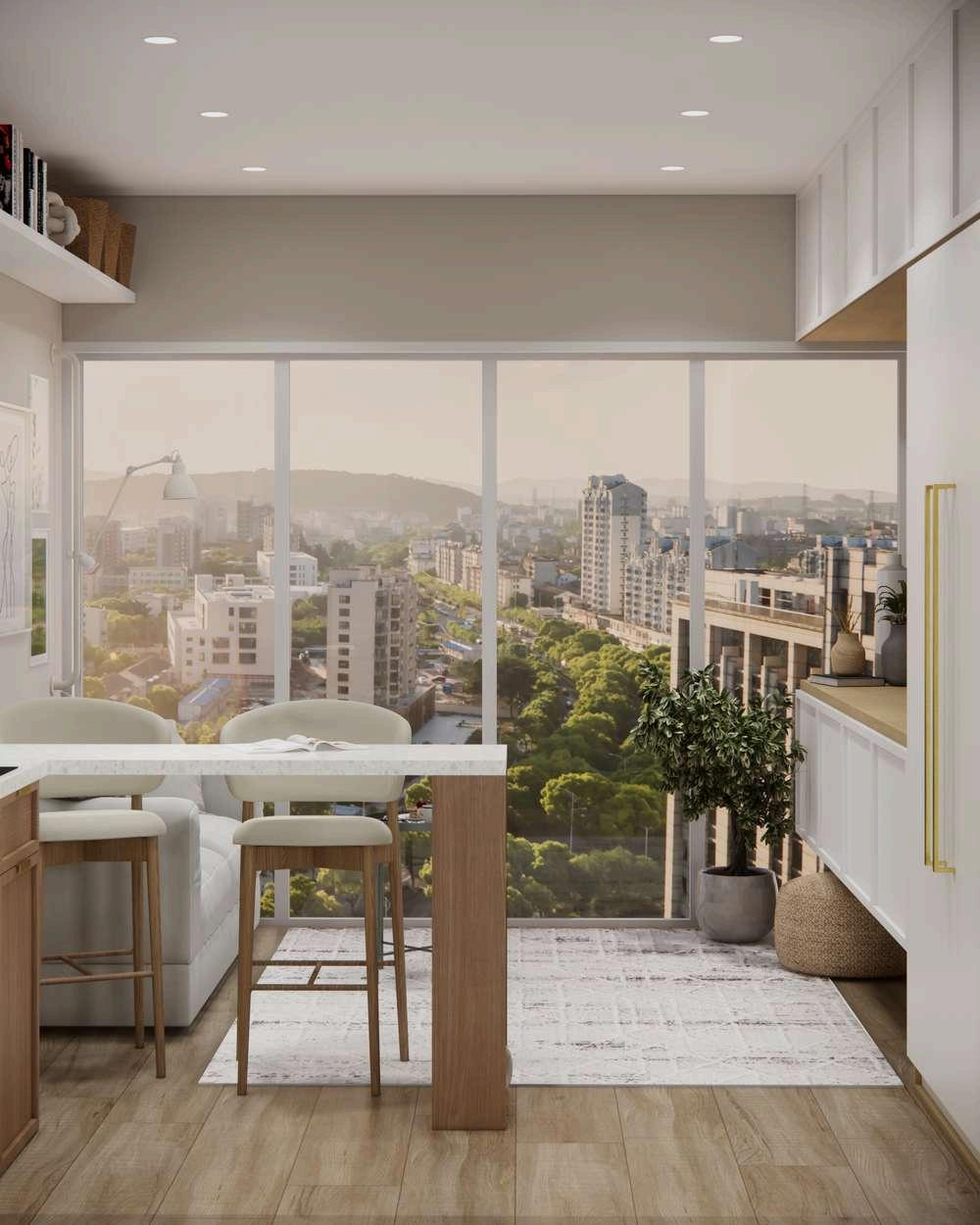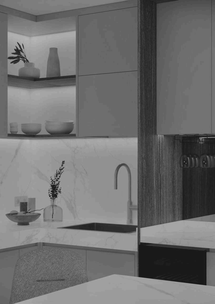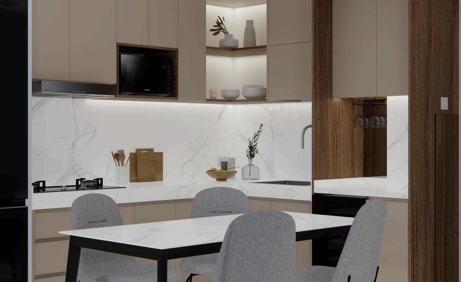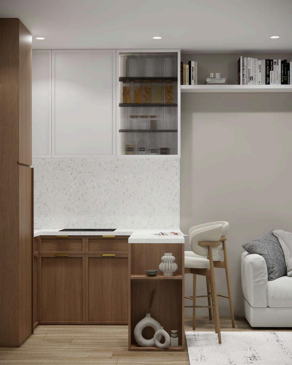 Living room dan kitchen ini merupakan kombinasi antara estetika Jepang yang tenang dan sederhana dengan sentuhan Skandinavia yang hangat dan ramah serta kepraktisan dapur yang sederhana dan elegan sekaligus memiliki penyimpanan yang rapi dan terorganisir untuk menciptakan ruang memasak yang efisien dan estetis Pada ruangan ini cenderung menggunakan warna netral seperti abu-abu cokelat muda dan putih serta pemilihan bahannya juga alami yaitu kayu solid batu, dan kain organik Furniture pada ruangan ini uga memiliki ciri khas yang minimalis dengan garis-garis yang bersih dan sederhana Kursi dan meja dengan desain yang simpel tetapi tetap fungsional Selain itu pencahayaan pada ruangan ini juga penting terutama pencahayaan alami yang sangat dihargai dalam gaya Japandi Jendela besar dan penggunaan lampu alami memungkinkan sinar matahari masuk ke dalam ruangan dan menciptakan suasana yang cerah dan nyaman